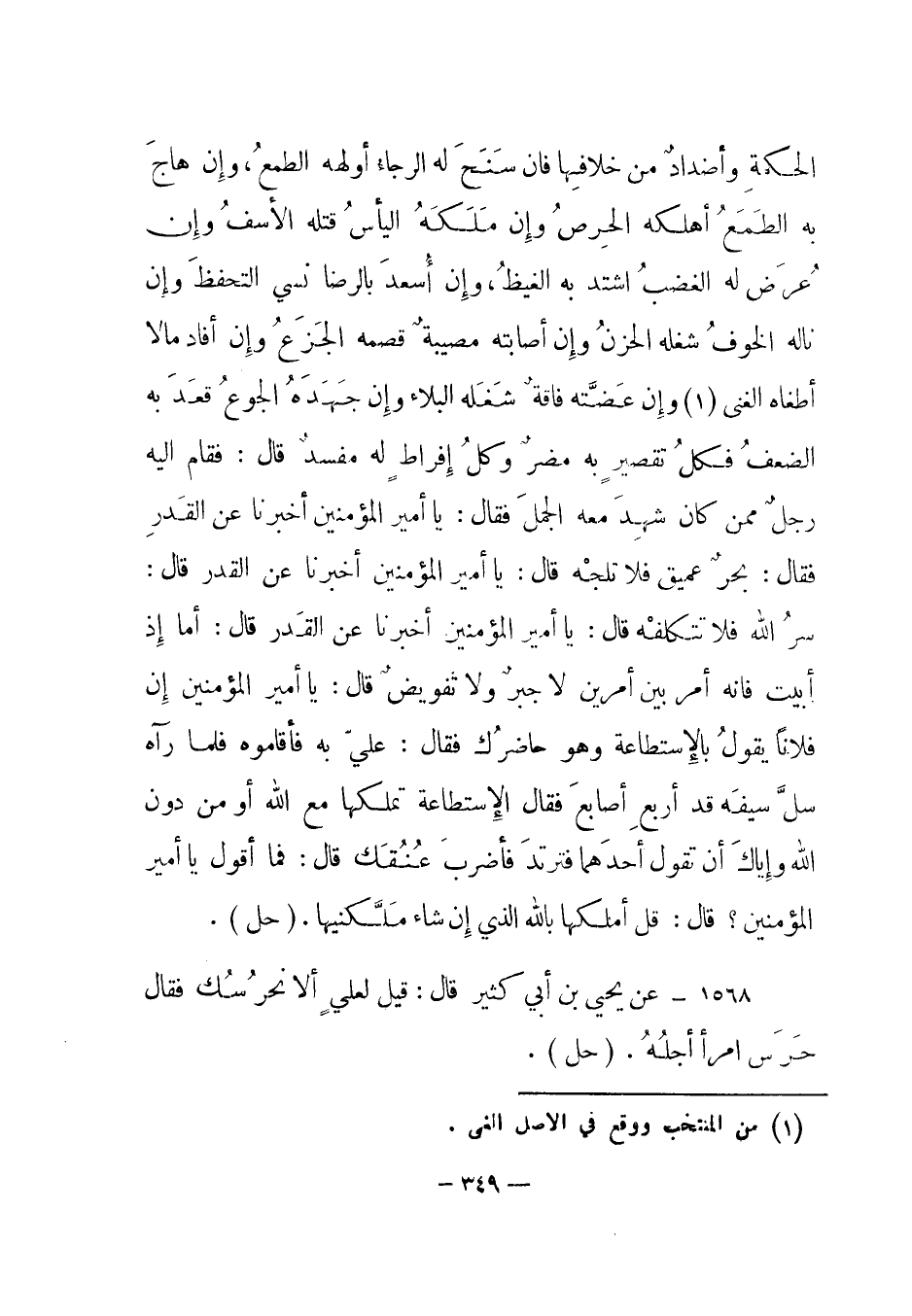 الحكمة وأضداد من خلافها فإن سنح له الرجاء أولهه الطمع، وإن هاج به الطمع أهلكه الحرص وإن ملكه اليأس قتله الأسف وإن عرض له الغضب اشتد به الغيظ، وإن أسعد بالرضا نسي التحفظ وإن ناله الخوف شغله الحزن وإن أصابته مصيبة قصمه الجزع وإن أفاد مالا أطغاه الغنى (1) وإن عضته فاقة شغله البلاء وإن جهده الجوع قعد به الضعف فكل تقصير به مضر وكل إفراط له مفسد قال: فقام إليه رجل ممن كان شهد معه الجمل فقال: يا أمير المؤمنين أخبرنا عن القدر فقال: بحر عميق فلا تلجه قال: يا أمير المؤمنين أخبرنا عن القدر قال: سر الله فلا تتكلفه قال: يا أمير المؤمنين أخبرنا عن القدر قال: أما إذ أبيت فإنه أمر بين أمرين لا جبر ولا تفويض قال: يا أمير المؤمنين إن فلانا يقول بالاستطاعة وهو حاضرك فقال: علي به فأقاموه فلما رآه سل سيفه قد أربع أصابع فقال الاستطاعة تملكها مع الله أو من دون الله وإياك أن تقول أحدهما فترتد فأضرب عنقك قال: فما أقول يا أمير المؤمنين؟ قال: قل أملكها بالله الذي إن شاء ملكنيها". (حل) .