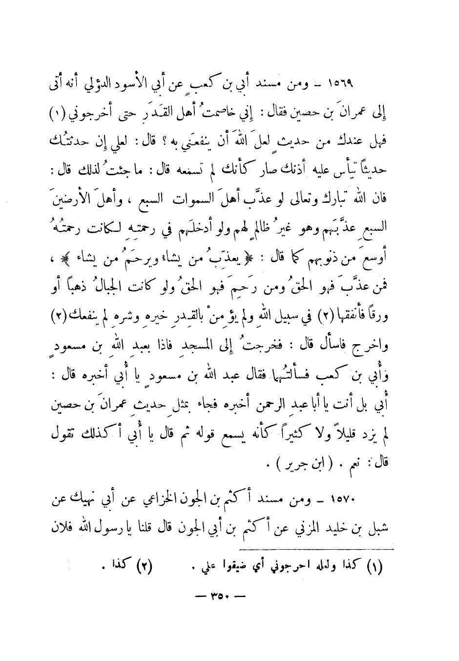 1569 - ومن مسند أبي بن كعب عن أبي الأسود الدؤلي أنه أتى إلى عمران بن حصين فقال: "إني خاصمت أهل القدر حتى أخرجوني (1) فهل عندك من حديث لعل الله أن ينفعني به؟ قال: لعلي إن حدثتك حديثا تيأس عليه أذنك صار كأنك لم تسمعه قال: ما جئت لذلك قال: فإن الله تبارك وتعالى لو عذب أهل السموات السبع، وأهل الأرضين السبع عذبهم وهو غير ظالم لهم ولو أدخلهم في رحمته لكانت رحمته أوسع من ذنوبهم كما قال: {يُعَذِّبُ مَنْ يَشَاءُ وَيَرْحَمُ مَنْ يَشَاءُ} ، فمن عذب فهو الحق ومن رحم فهو الحق ولو كانت الجبال ذهبا أو ورقا فأنفقها (2) في سبيل الله ولم يؤمن بالقدر خيره وشره لم ينفعك (2) (كذا) واخرج فاسأل قال: فخرجت إلى المسجد فإذا بعبد الله بن مسعود وأبي بن كعب فسألتهما فقال عبد الله بن مسعود يا أبي أخبره قال: أبي بل أنت يا أبا عبد الرحمن أخبره فجاء بمثل حديث عمران بن حصين لم يزد قليلا ولا كثيرا كأنه يسمع قوله ثم قال يا أبي أكذلك تقول قال: نعم". (ابن جرير) .