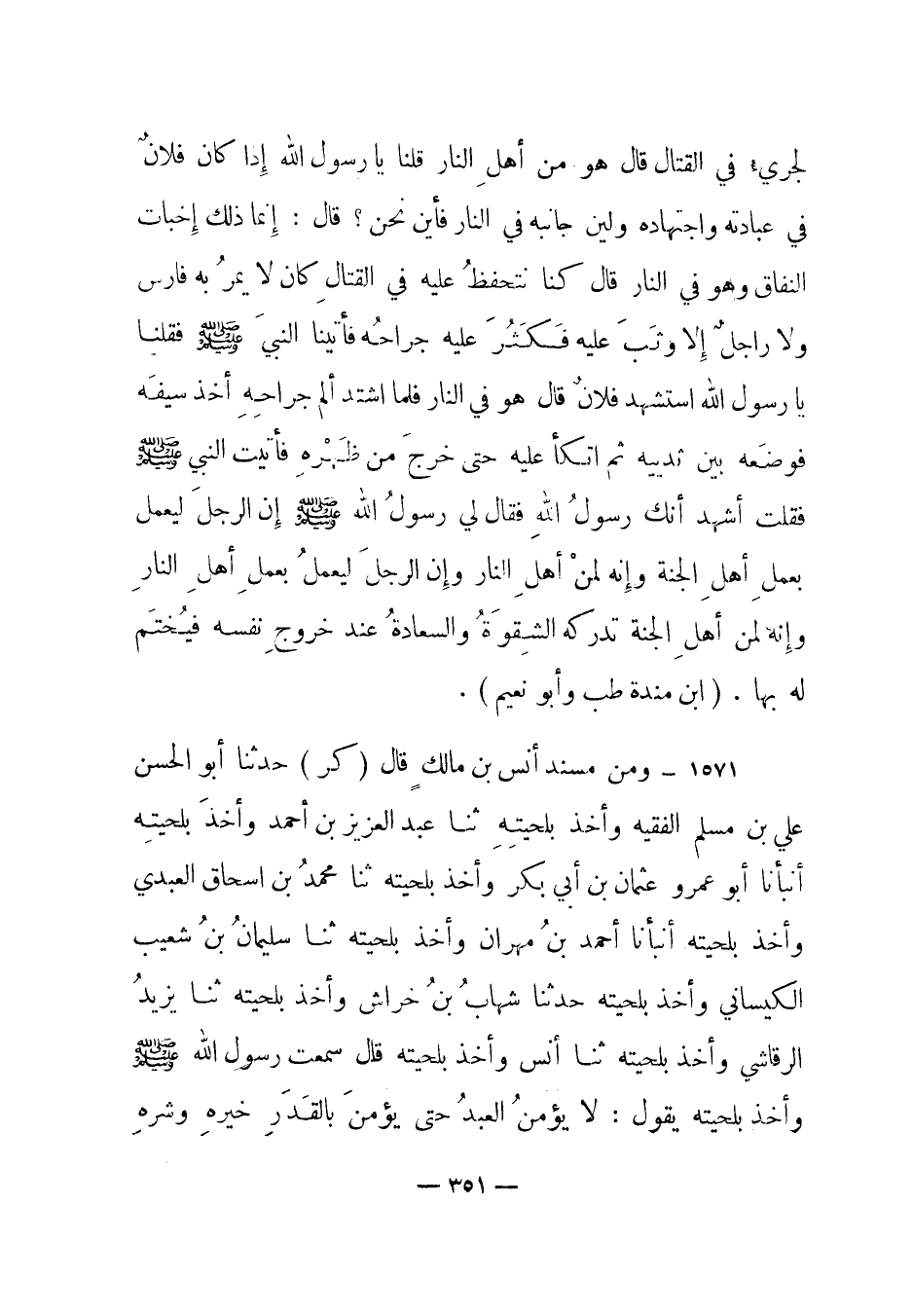 1571 - ومن مسند أنس بن مالك قال (كر) حدثنا أبو الحسن علي بن مسلم الفقيه وأخذ بلحيته ثنا عبد العزيز بن أحمد وأخذ بلحيته أنبأنا أبوعمرو عثمان بن أبي بكر وأخذ بلحيته ثنا محمد بن إسحاق العبدي وأخذ بلحيته أنبأنا أحمد بن مهران وأخذ بلحيته ثنا سليمان بن شعيب الكيساني وأخذ بلحيته حدثنا شهاب بن خراش وأخذ بلحيته ثنا يزيد الرقاشي وأخذ بلحيته ثنا أنس وأخذ بلحيته قال سمعت رسول الله صلى الله عليه وسلم يقول: لا يؤمن العبد حتى يؤمن بالقدر خيره وشره