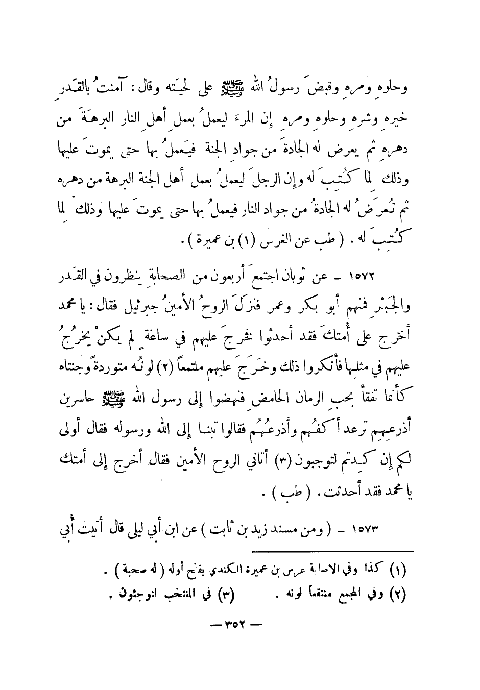 1572 - عن ثوبان اجتمع أربعون من الصحابة ينظرون في القدر والجبر فمنهم أبو بكر وعمر فنزل الروح الأمين جبرئيل فقال: يا محمد أخرج على أمتك فقد أحدثوا فخرج عليهم في ساعة لم يكن يخرج عليهم في مثلها فأنكروا ذلك وخرج عليهم ملتمعا (2) لونه متوردة وجنتاه كأنما تفقأ بحب الرمان الحامض فنهضوا إلى رسول الله صلى الله عليه وسلم حاسرين أذرعهم ترعد أكفهم وأذرعهم فقالوا تبنا إلى الله ورسوله فقال أولى لكم إن كدتم لتوجبون (3) أتاني الروح الأمين فقال أخرج إلى أمتك يا محمد فقد أحدثت". (طب) .