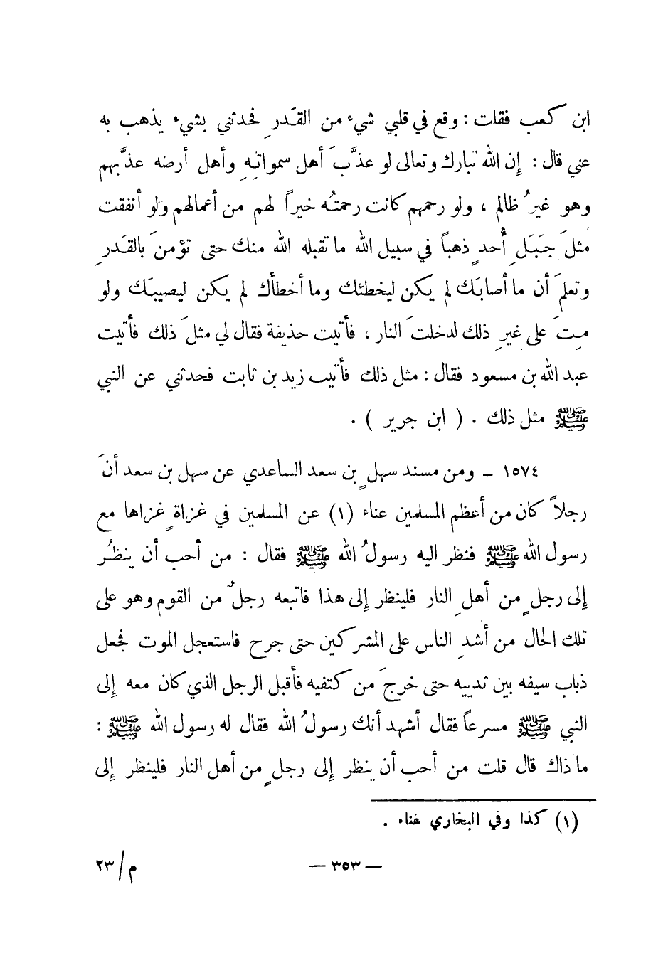 1574 - ومن مسند سهل بن سعد الساعدي عن سهل بن سعد " أن رجلا كان من أعظم المسلمين عناء (1) عن المسلمين في غزاة غزاها مع رسول الله صلى الله عليه وسلم فنظر إليه رسول الله صلى الله عليه وسلم فقال: من أحب أن ينظر إلى رجل من أهل النار فلينظر إلى هذا فاتبعه رجل من القوم وهو على تلك الحال من أشد الناس على المشركين حتى جرح فاستعجل الموت فجعل ذباب سيفه بين ثدييه حتى خرج من كتفيه فأقبل الرجل الذي كان معه إلى النبي صلى الله عليه وسلم مسرعا فقال أشهد أنك رسول الله فقال له رسول الله صلى الله عليه وسلم: ما ذاك قال قلت من أحب أن ينظر إلى رجل من أهل النار فلينظر إلى
