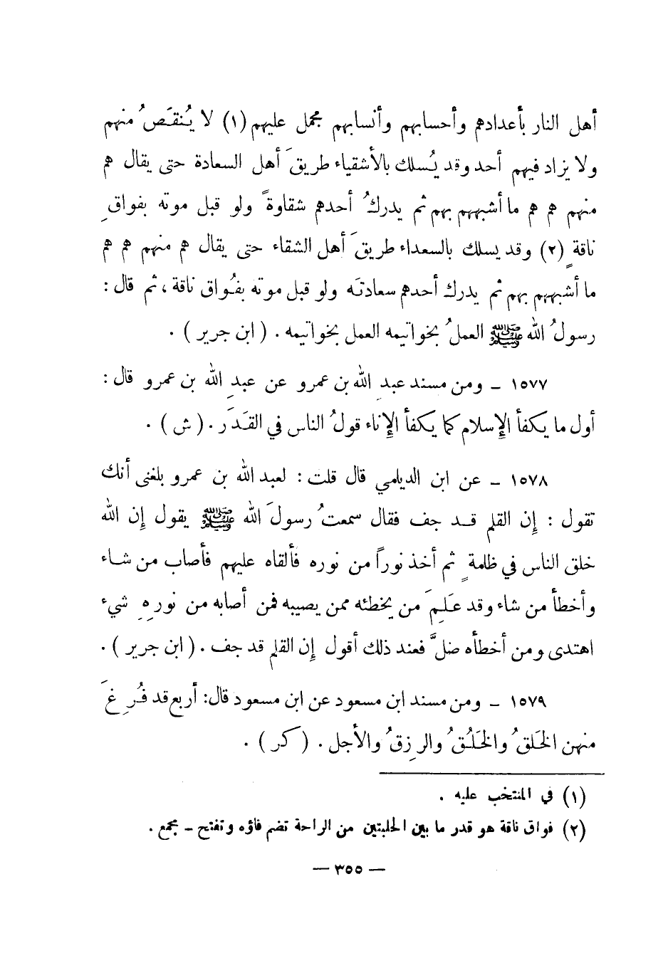 1578 - عن ابن الديلمي قال قلت: لعبد الله بن عمرو بلغنى أنك تقول: "إن القلم قد جف فقال سمعت رسول الله صلى الله عليه وسلم يقول: " إن الله خلق الناس في ظلمة ثم أخذ نورا من نوره فألقاه عليهم فأصاب من شاء وأخطأ من شاء وقد علم من يخطئه ممن يصيبه فمن أصابه من نوره شيء اهتدى ومن أخطأه ضل" فعند ذلك أقول إن القلم قد جف". (ابن جرير) .