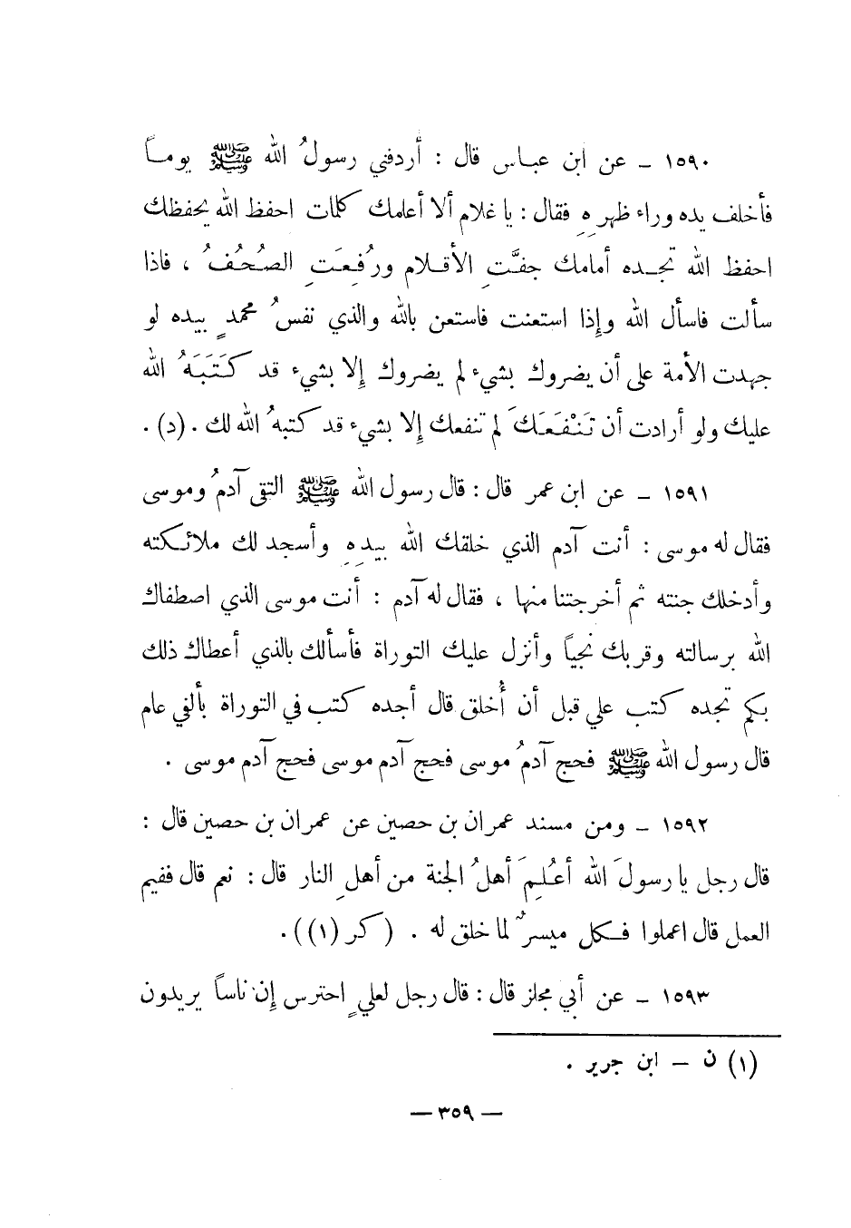 1591 - عن ابن عمر قال: قال رسول الله صلى الله عليه وسلم "التقى آدم وموسى فقال له موسى: أنت آدم الذي خلقك الله بيده وأسجد لك ملائكته وأدخلك جنته ثم أخرجتنا منها، فقال له أدم: أنت موسى الذي اصطفاك الله برسالته وقربك نجيا وأنزل عليك التوراة فأسألك بالذي أعطاك ذلك بكم تجده كتب علي قبل أن أخلق قال أجده كتب في التوراة بألفي عام قال رسول الله صلى الله عليه وسلم فحج آدم موسى فحج آدم موسى فحج آدم موسى".