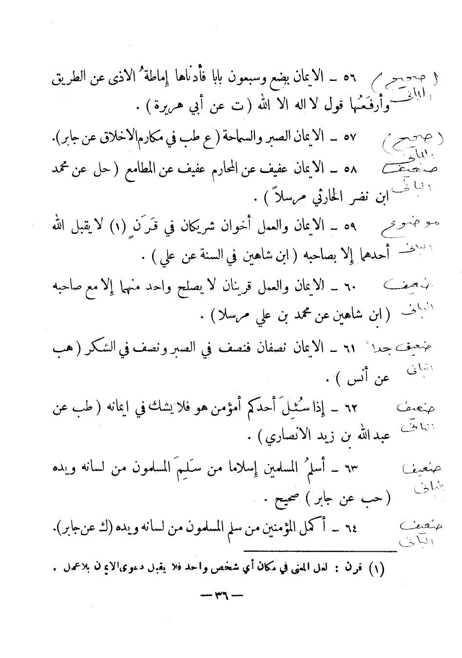 56- "الإيمان بضع وسبعون بابا. فأدناها إماطة الأذى عن الطريق وأرفعها قول لا إله إلا الله" (ت عن أبي هريرة) .