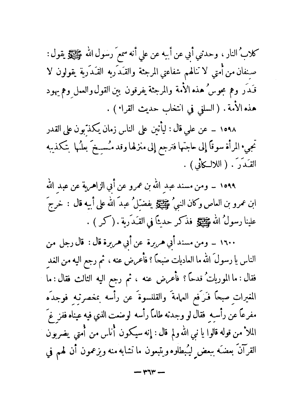 1598 - عن علي قال: "ليأتين على الناس زمان يكذبون على القدر تجيء المرأة سوقا إلى حاجتها فترجع إلى منزلها وقد مسخ بعلها بتكذيبه القدر". (اللالكائي) .