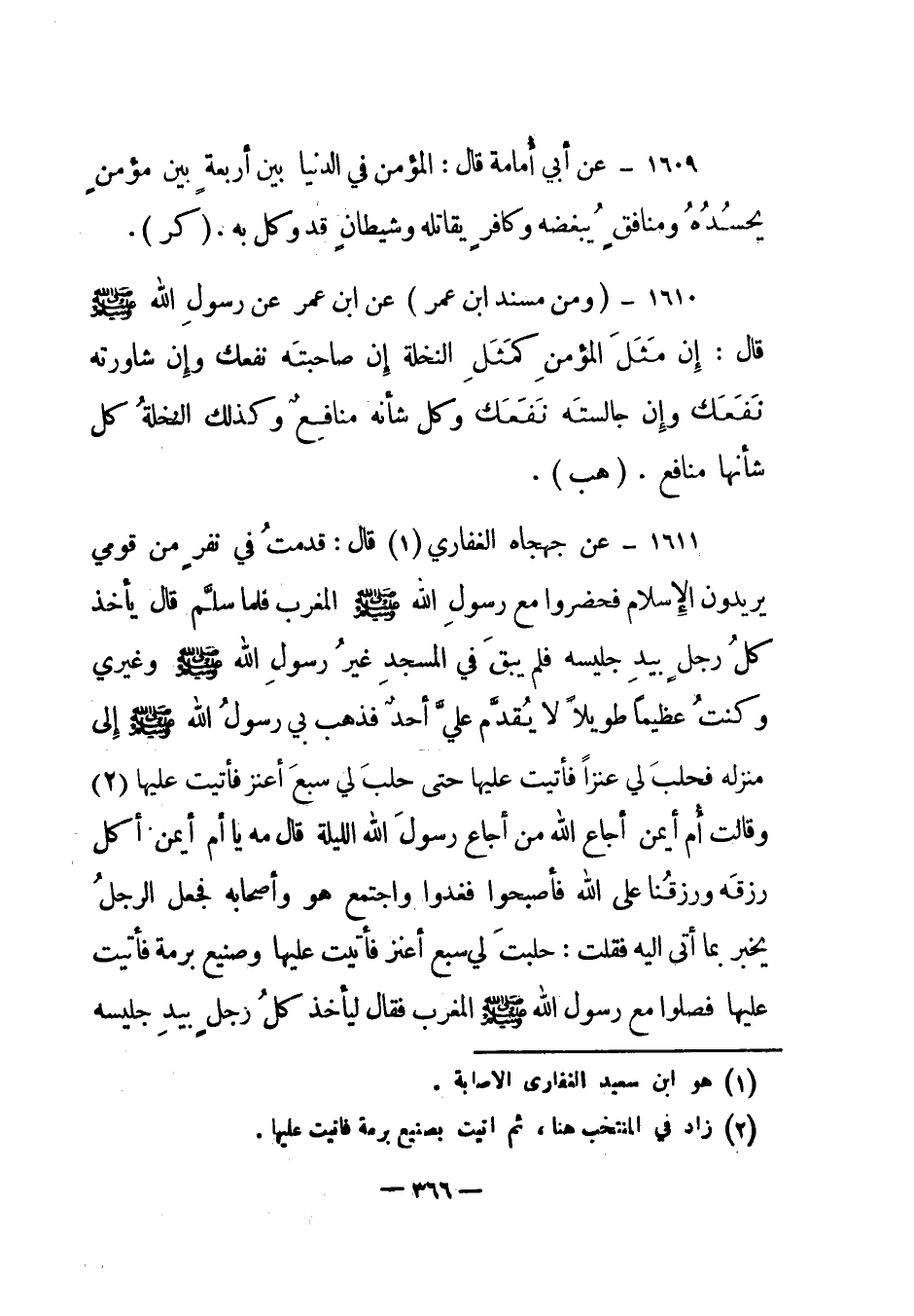 1610 - (ومن مسند ابن عمر) عن ابن عمر عن رسول الله صلى الله عليه وسلم قال: "إن مثل المؤمن كمثل النخلة إن صاحبته نفعك وإن شاورته نفعك وإن جالسته نفعك وكل شأنه منافع وكذلك النخلة كل شأنها منافع". (هب) .