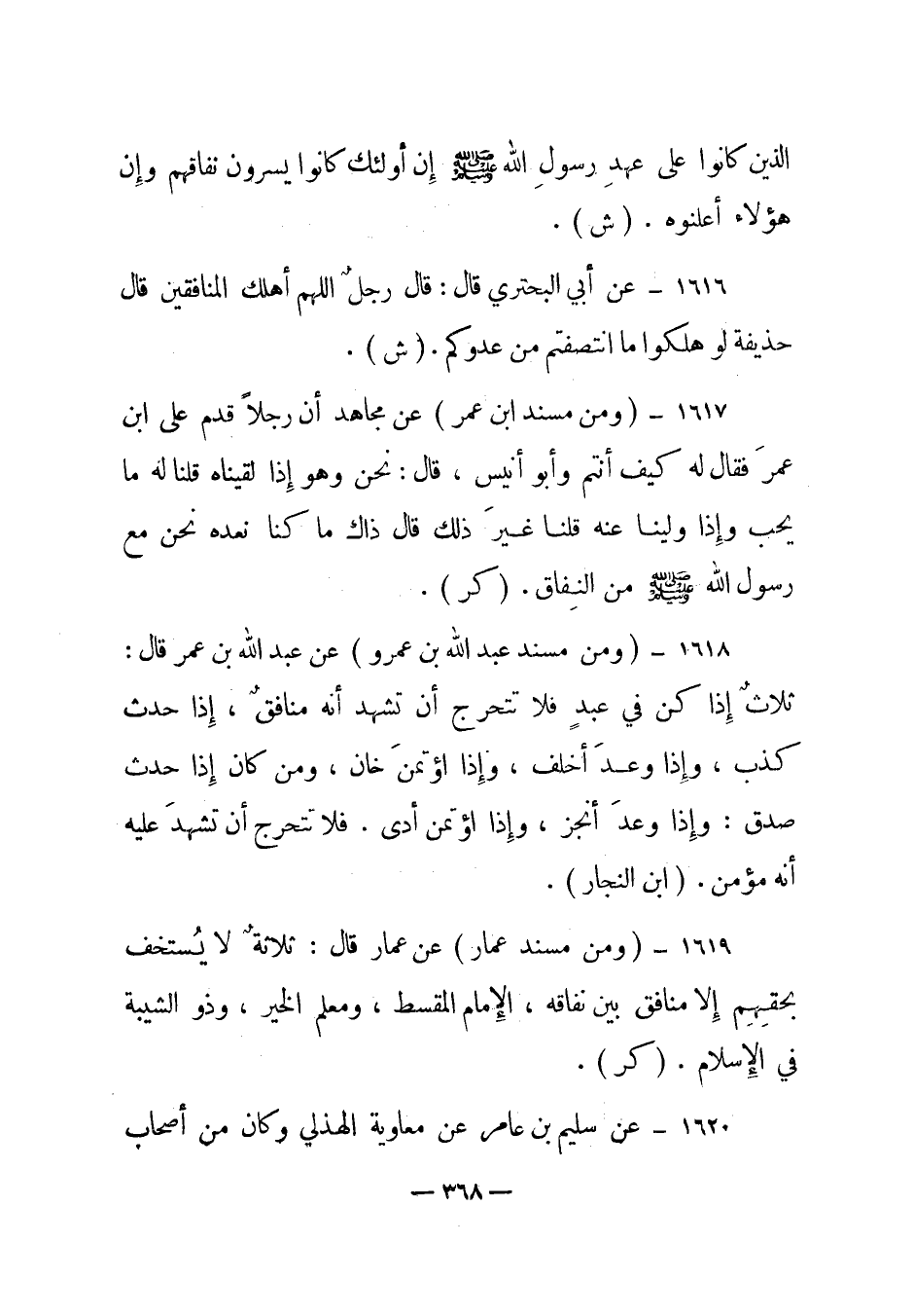 1618 - (ومن مسند عبد الله بن عمرو) عن عبد الله بن عمر قال: "ثلاث إذا كن في عبد فلا تتحرج أن تشهد أنه منافق، إذا حدث كذب، وإذا وعد أخلف، وإذا اؤتمن خان، ومن كان إذا حدث صدق: وإذا وعد أنجز، وإذا اؤتمن أدى. فلا تتحرج أن تشهد عليه أنه مؤمن". (ابن النجار) .