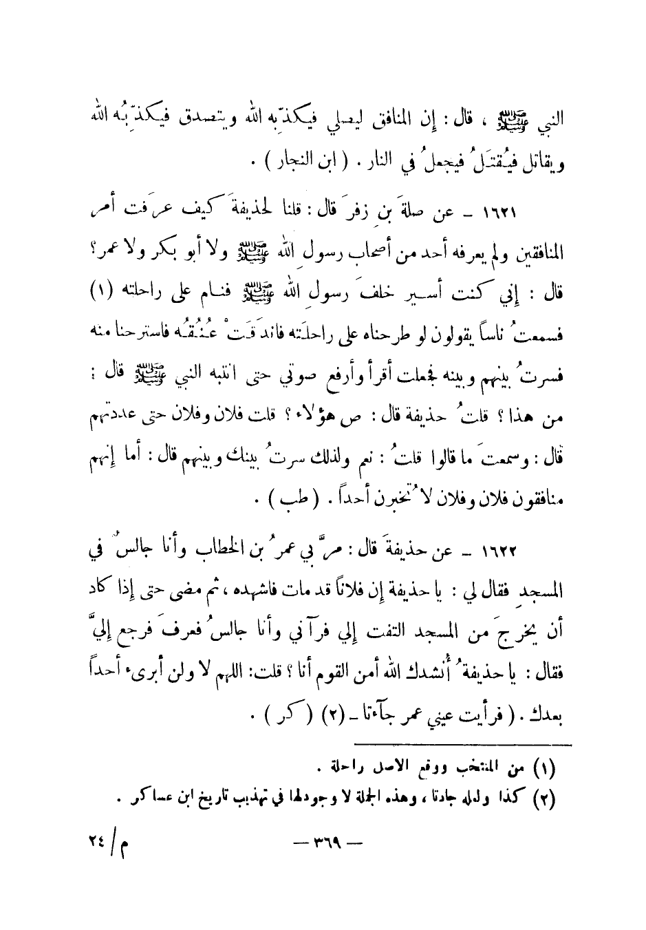 1621 - عن صلة بن زفر قال: "قلنا لحذيفة كيف عرفت أمر المنافقين ولم يعرفه أحد من أصحاب رسول الله صلى الله عليه وسلم ولا أبو بكر ولا عمر؟ قال: إني كنت أسير خلف رسول الله صلى الله عليه وسلم فنام على راحلته (1) فسمعت ناسا يقولون لو طرحناه على راحلته فاندقت عنقه فاسترحنا منه فسرت بينهم وبينه فجعلت أقرأ وأرفع صوتي حتى انتبه النبي صلى الله عليه وسلم قال: من هذا؟ قلت حذيفة قال: ص هؤلاء؟ قلت فلان وفلان حتى عددتهم قال: وسمعت ما قالوا قلت: نعم ولذلك سرت بينك وبينهم قال: أما إنهم منافقون فلان وفلان لا تخبرن أحدا". (طب) .