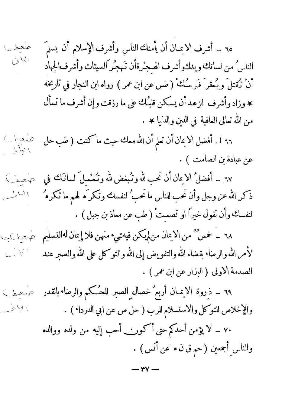 67 – "أفضل الإيمان أن تحب لله وتبغض لله وتعمل لسانك في ذكر الله عز وجل وأن تحب للناس ماتحب لنفسك وتكره لهم ماتكره لنفسك وأن تقول خيرا أو تصمت" (طب عن معاذ بن جبل) .