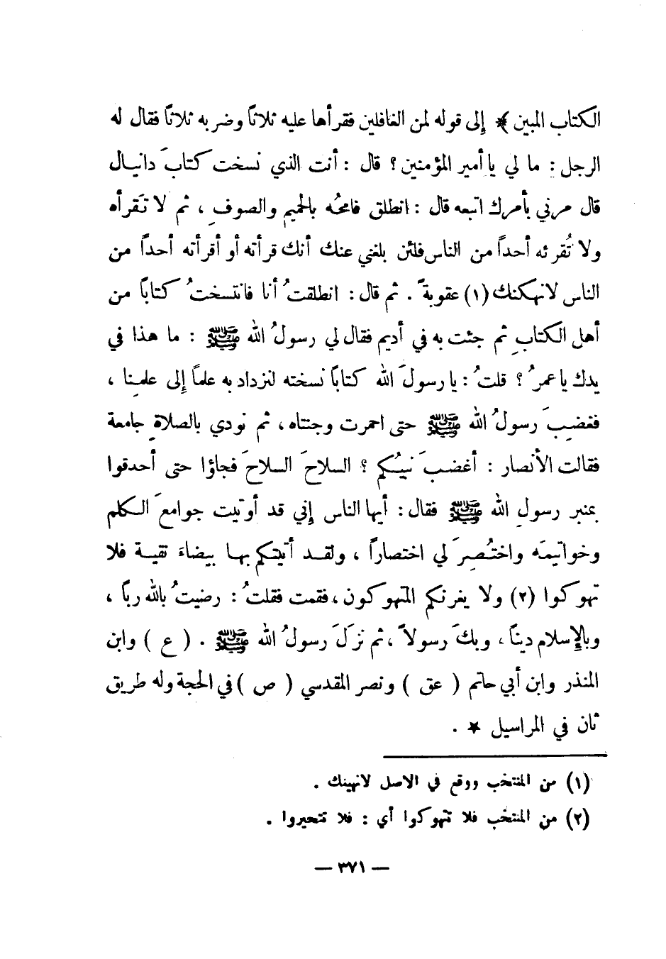 الْكِتَابِ الْمُبِينِ} إلى قوله: {لَمِنَ الْغَافِلِينَ} فقرأها عليه ثلاثا وضربه ثلاثا فقال له الرجل: ما لي يا أمير المؤمنين؟ قال: أنت الذي نسخت كتاب دانيال قال مرني بأمرك اتبعه قال: انطلق فامحه بالحميم والصوف، ثم لا تقرأه ولا تقرئه أحدا من الناس فلئن بلغني عنك أنك قرأته أو أقرأته أحدا من الناس لانهكنك (1) عقوبة. ثم قال: انطلقت أنا فانتسخت كتابا من أهل الكتاب ثم جئت به في أديم فقال لي رسول الله صلى الله عليه وسلم: ما هذا في يدك يا عمر؟ قلت: يا رسول الله كتابا نسخته لنزداد به علما إلى علمنا، فغضب رسول الله صلى الله عليه وسلم حتى احمرت وجنتاه، ثم نودي بالصلاة جامعة فقالت الأنصار: أغضب نبيكم؟ السلاح السلاح فجاؤا حتى أحدقوا بمنبر رسول الله صلى الله عليه وسلم فقال: أيها الناس إني قد أوتيت جوامع الكلم وخواتيمه واختصر لي اختصارا، ولقد أتيتكم بها بيضاء نقية فلا تهوكوا (2) ولا يغرنكم المتهوكون، فقمت فقلت: رضيت بالله ربا، وبالإسلام دينا، وبك رسولا، ثم نزل رسول الله صلى الله عليه وسلم.