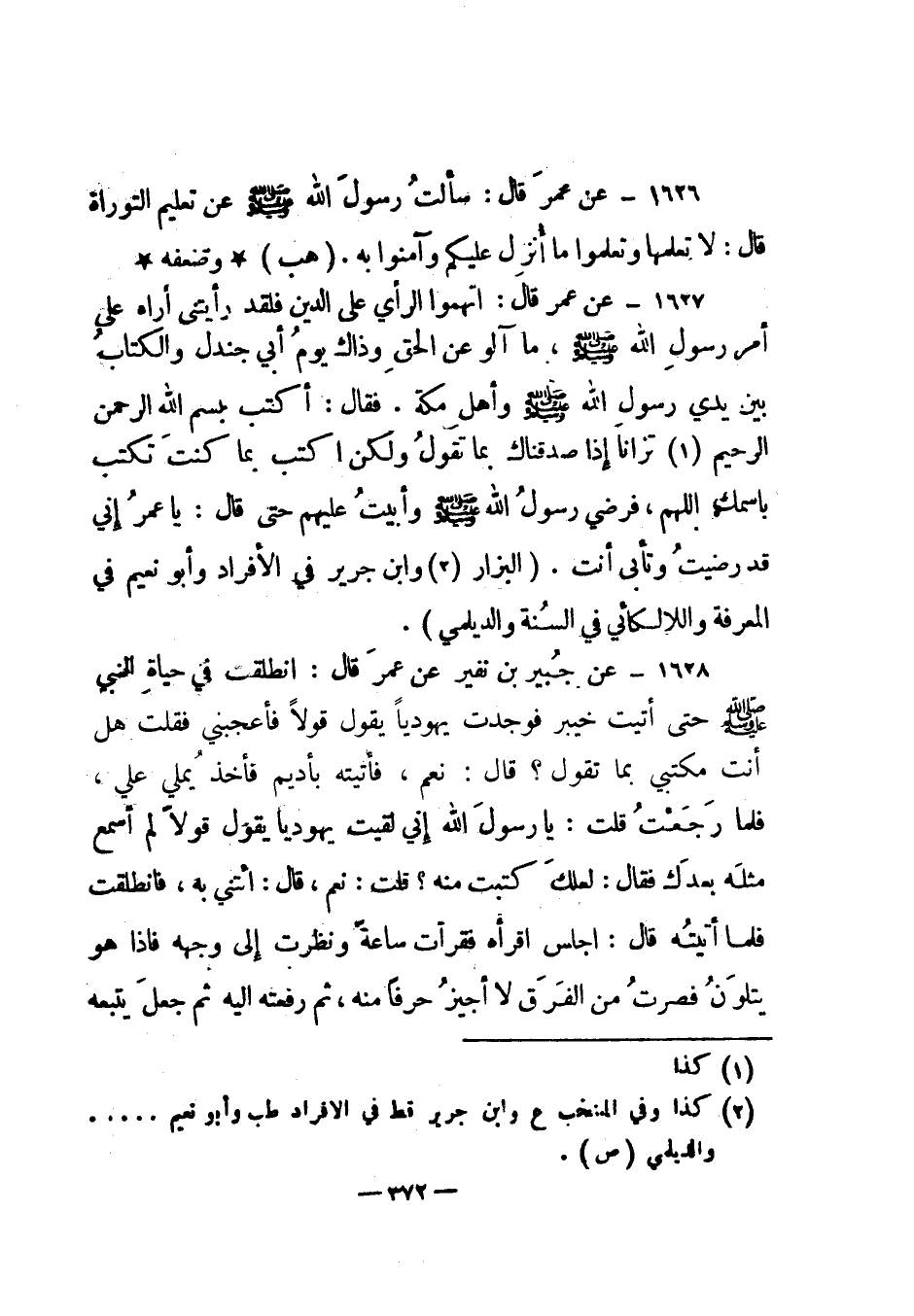 1628 - عن جبير بن نفير عن عمر قال: انطلقت في حياة النبي صلى الله عليه وسلم حتى أتيت خيبر فوجدت يهوديا يقول قولا فأعجبني فقلت هل أنت مكتبي بما تقول؟ قال: نعم، فأتيته بأديم فأخذ يملي علي، فلما رجعت قلت: يا رسول الله إني لقيت يهوديا يقول قولا لم أسمع مثله بعدك فقال: لعلك كتبت منه؟ قلت: نعم، قال: ائتني به، فانطلقت فلما أتيته قال: اجلس اقرأه فقرأت ساعة ونظرت إلى وجهه فإذا هو يتلون فصرت من الفرق لا أجيز حرفا منه، ثم رفعته إليه ثم جعل يتبعه
