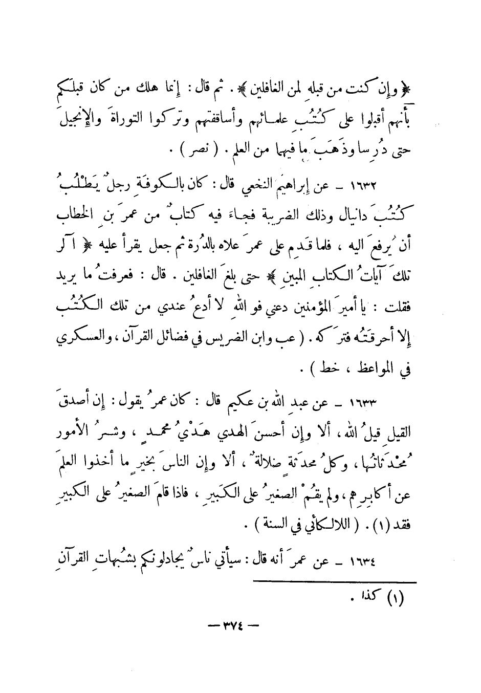 1632 - عن إبراهيم النخعي قال: "كان بالكوفة رجل يطلب كتب دانيال وذلك الضريبة فجاء فيه كتاب من عمر بن الخطاب أن يرفع إليه، فلما قدم على عمر علاه بالدرة ثم جعل يقرأ عليه {الر تِلْكَ آيَاتُ الْكِتَابِ الْحَكِيمِ} حتى بلغ الغافلين. قال: فعرفت ما يريد فقلت: يا أمير المؤمنين دعني فوالله لا أدع عندي من تلك الكتب إلا أحرقته فتركه. (عب وابن الضريس في فضائل القرآن، والعسكري في المواعظ، خط) .