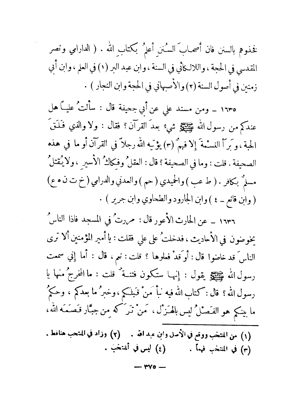 1635 - ومن مسند علي عن أبي جحيفة قال: "سألت عليا هل عندكم من رسول الله صلى الله عليه وسلم شيء بعد القرآن؟ فقال: ولا والذي فلق الحبة، وبرأ النسمة إلا فهم (3) يؤتيه الله رجلا في القرآن أو ما في هذه الصحيفة. قلت: وما في الصحيفة؟ قال: العقل وفكاك الأسير، ولا يقتل مسلم بكافر". (ط عب) والحميدي (حم) والعدني والدارمي (خ ت ن هـ ع) (وابن قانع – (4)) وابن الجارود والطحاوي وابن جرير) .