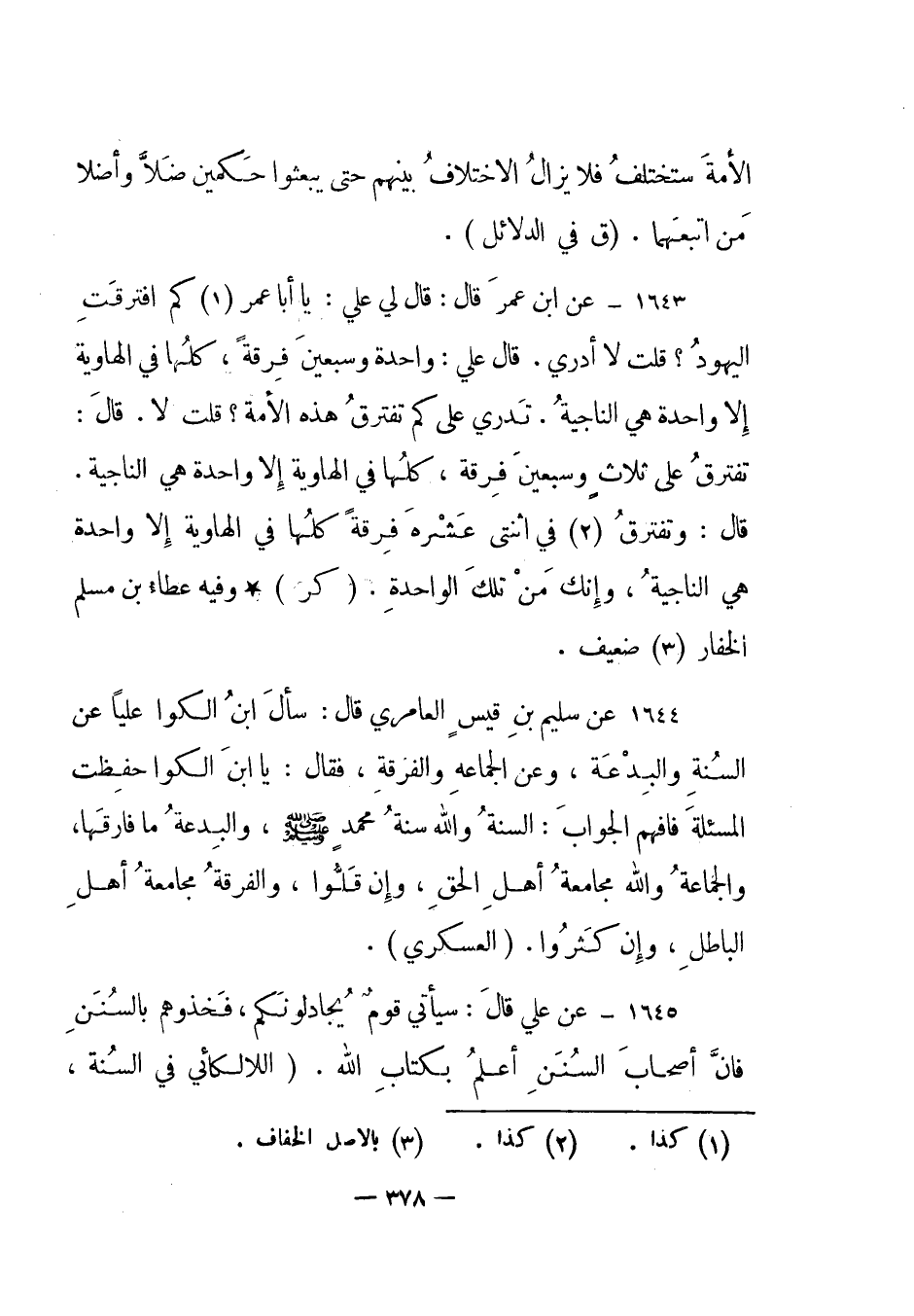 1643 - عن ابن عمر قال: "قال لي علي: يا أبا عمر (1) كم افترقت اليهود؟ قلت لا أدري. قال علي: واحدة وسبعين فرقة، كلها في الهاوية إلا واحدة هي الناجية. تدري على كم تفترق هذه الأمة؟ قلت لا. قال: تفترق على ثلاث وسبعين فرقة، كلها في الهاوية إلا واحدة هي الناجية. قال: وتفترق (2) في اثنتي عشره فرقة كلها في الهاوية إلا واحدة هي الناجية، وإنك من تلك الواحدة". (كر) وفيه عطاء بن مسلم الخفار (3) ضعيف.