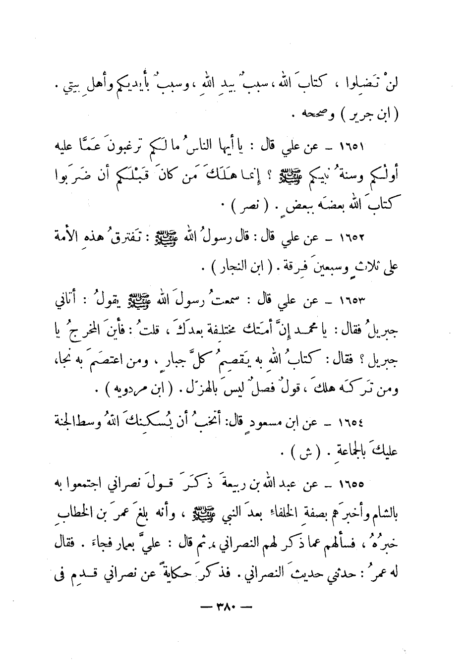 1651 - عن علي قال: "يا أيها الناس ما لكم ترغبون عما عليه أولكم وسنة نبيكم صلى الله عليه وسلم؟ إنما هلك من كان قبلكم أن ضربوا كتاب الله بعضه ببعض" (نصر) .