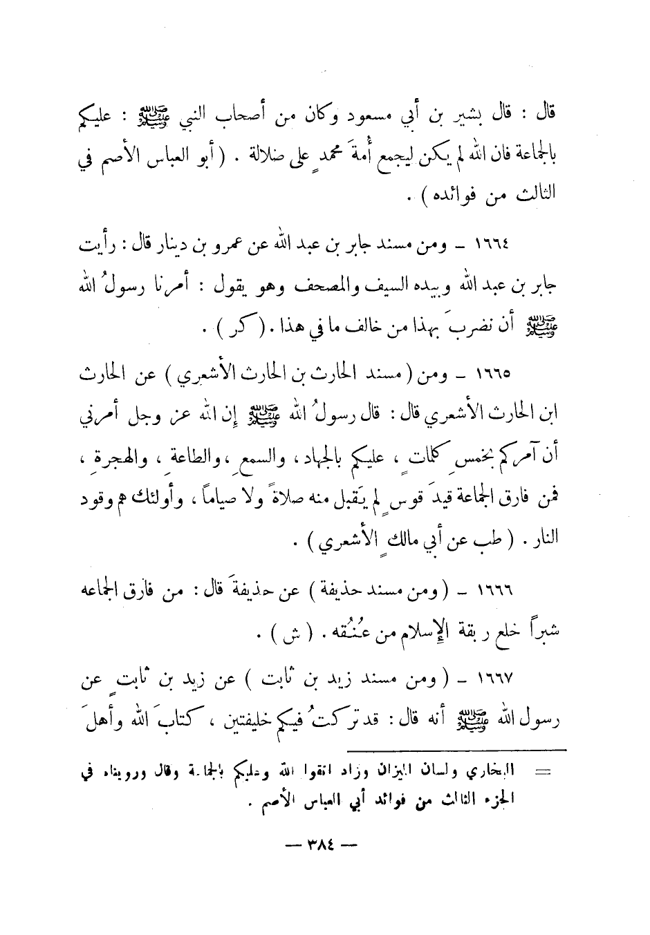 قال: "قال بشير بن أبي مسعود وكان من أصحاب النبي صلى الله عليه وسلم: "عليكم بالجماعة فإن الله لم يكن ليجمع أمة محمد على ضلالة". (أبوالعباس الأصم في الثالث من فوائده) .
