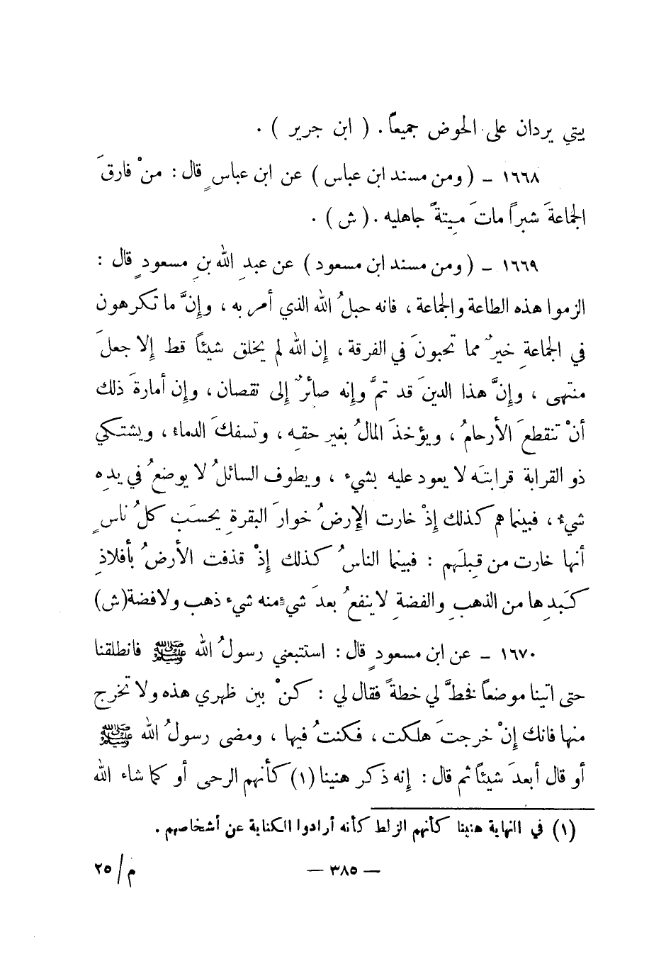 1668 - (ومن مسند ابن عباس) عن ابن عباس قال:"من فارق الجماعة شبرا مات ميتة جاهليه". (ش) .