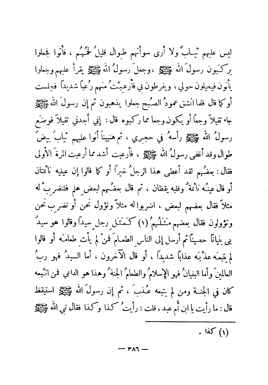 ليس عليهم ثياب ولا أرى سوأتهم طوال قليل لحمهم، فأتوا فجعلوا يركبون رسول الله صلى الله عليه وسلم، وجعل رسول الله صلى الله عليه وسلم يقرأ عليهم وجعلوا يأتون فيحيلون حولي، ويفرطون بي فأرعبت منهم رعبا شديدا فجلست أو كما قال فلما انشق عمود الصبح جعلوا يذهبون ثم إن رسول الله صلى الله عليه وسلم جاء ثقيلا وجعا أو يكون وجعا مما ركبوه قال: إني أجدني ثقيلا فوضع رسول الله صلى الله عليه وسلم رأسه في حجري، ثم هنيينا أتوا عليهم ثياب بيض طوال وقد أغفى رسول الله صلى الله عليه وسلم، فأرعبت أشد مما أرعبت المرة الأولى فقال: بعضهم لقد أعطى هذا الرجل خيرا أو كما قالوا إن عينيه نائمتان أو قال عينه نائمة وقلبه يقظان، ثم قال بعضهم لبعض هلم فلنضرب له مثلا فقال بعضهم لبعض، اضربوا له مثلا ونؤول نحن أو نضرب نحن وتؤولون فقال بعضهم مثلهم (1) كمثل رجل سيدا وقالوا هو سيد بنى بنيانا حصينا ثم أرسل إلى الناس الطعام فمن لم يأت طعامه أو قالوا لم يتبعه عذبه عذابا شديدا، أو قال الآخرون، أما السيد فهو رب العالمين وأما البنيان فهو الإسلام والطعام الجنة وهذا هو الداعي فمن اتبعه كان في الجنة ومن لم يتبعه عذب، ثم إن رسول الله صلى الله عليه وسلم استيقظ قال: ما رأيت يا ابن أم عبد، قلت: رأيت كذا وكذا فقال نبي الله صلى الله عليه وسلم