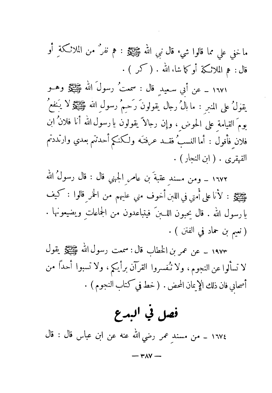 1673 - عن عمر بن الخطاب قال: سمعت رسول الله صلى الله عليه وسلم يقول: " لا تسألوا عن النجوم، ولا تفسروا القرآن برأيكم، ولا تسبوا أحدا من أصحابي فإن ذلك الإيمان المحض". (خط في كتاب النجوم) .
