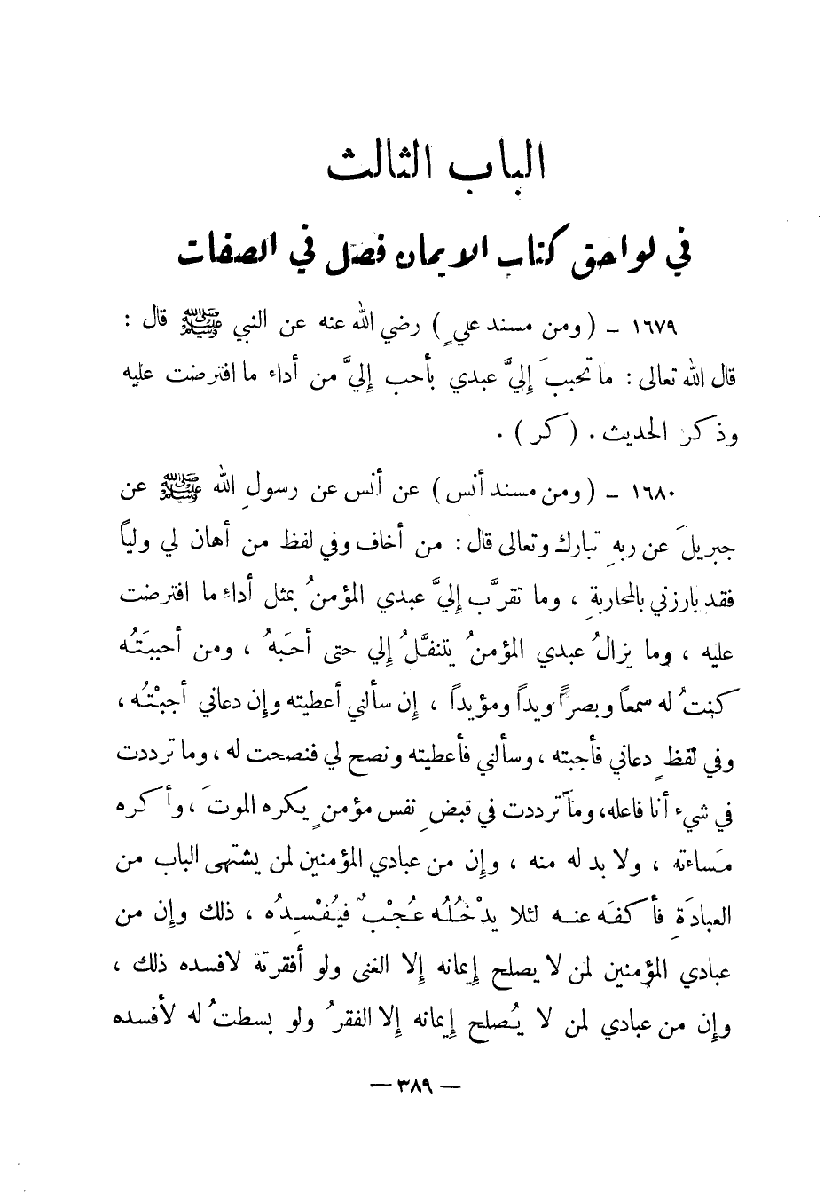 1680 - (ومن مسند أنس) عن أنس عن رسول الله صلى الله عليه وسلم عن جبريل عن ربه تبارك وتعالى قال: "من أخاف وفي لفظ من أهان لي وليا فقد بارزني بالمحاربة، وما تقرب إلي عبدي المؤمن بمثل أداء ما افترضت عليه، وما يزال عبدي المؤمن يتنفل إلي حتى أحبه، ومن أحببته كنت له سمعا وبصرا ويدا ومؤيدا، إن سألني أعطيته وإن دعاني أجبته، وفي لفظ دعاني فأجبته، وسألني فأعطيته ونصح لي فنصحت له، وما ترددت في شيء أنا فاعله، وما ترددت في قبض نفس مؤمن يكره الموت، وأكره مساءته، ولا بد له منه، وإن من عبادي المؤمنين لمن يشتهى الباب من العبادة فأكفه عنه لئلا يدخله عجب فيفسده، ذلك وإن من عبادي المؤمنين لمن لا يصلح إيمانه إلا الغنى ولو أفقرته لافسده ذلك، وإن من عبادي لمن لا يصلح إيمانه إلا الفقر ولو بسطت له لأفسده