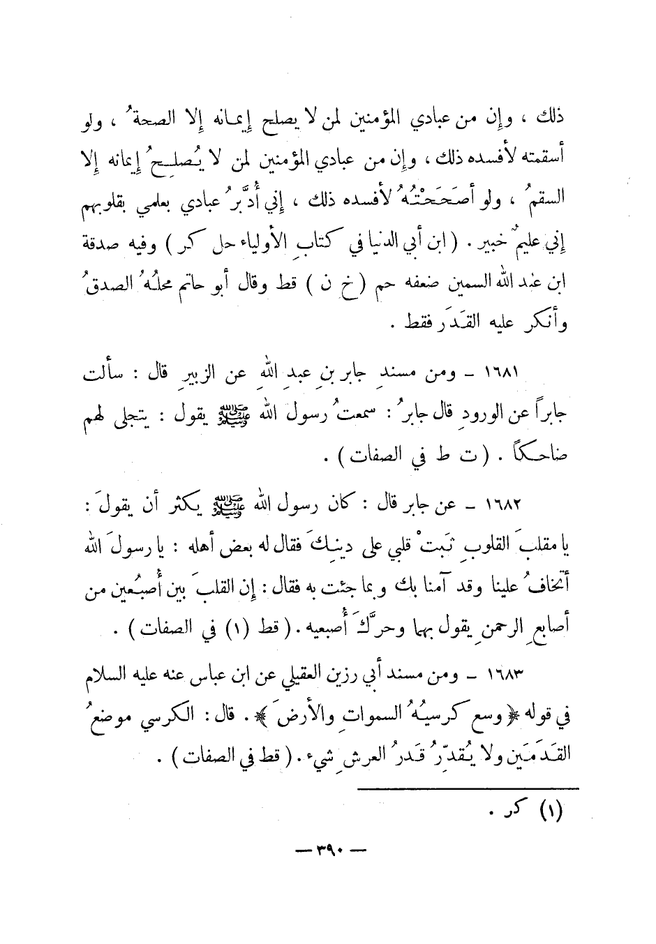 1683 - ومن مسند أبي رزين العقيلي عن ابن عباس عنه عليه السلام في قوله {وَسِعَ كُرْسِيُّهُ السَّمَاوَاتِ وَالأَرْضَ} . قال: "الكرسي موضع القدمين ولا يقدر قدر العرش شيء". (قط في الصفات) .