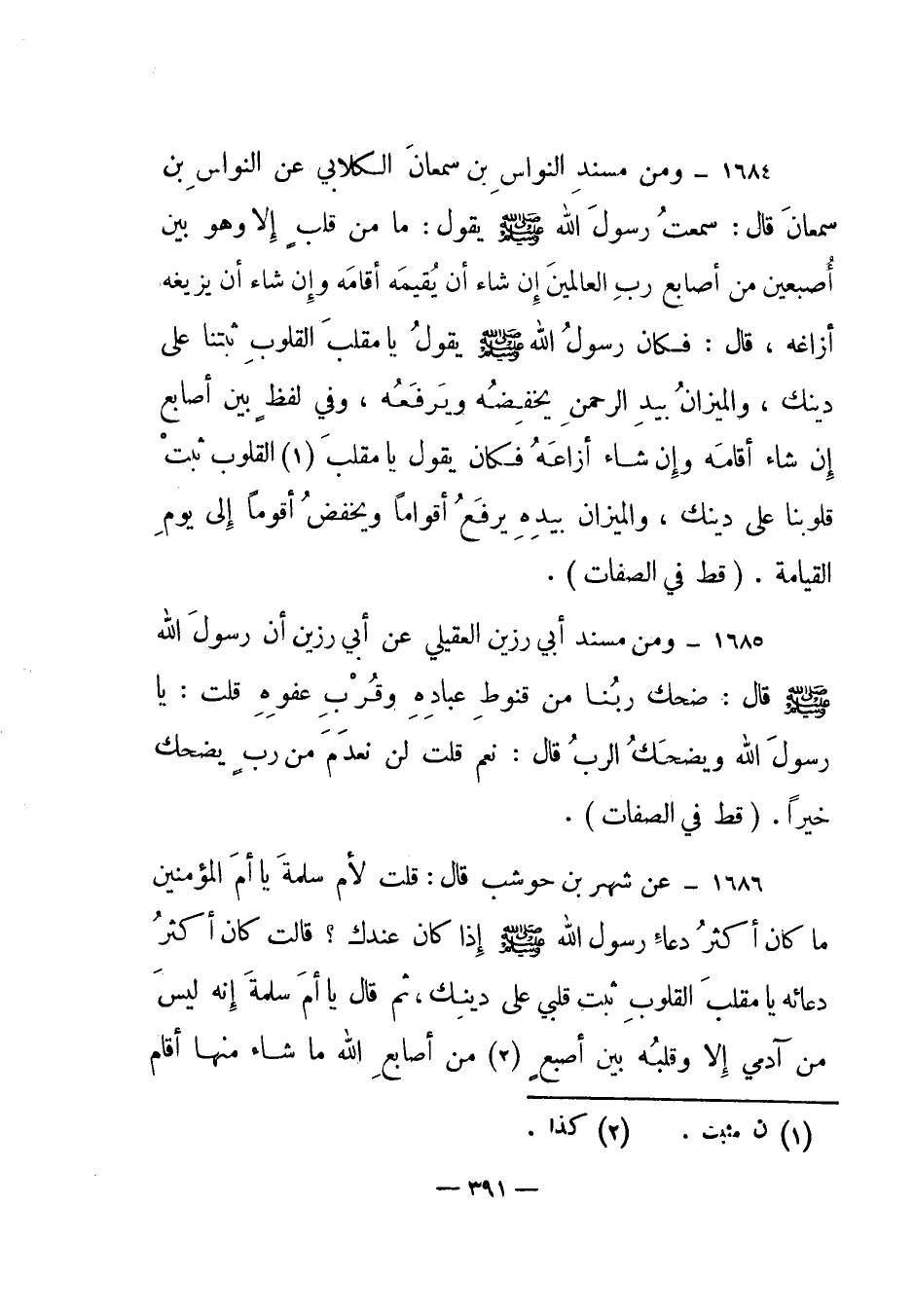 1684 - ومن مسند النواس بن سمعان الكلابي عن النواس بن سمعان قال: "سمعت رسول الله صلى الله عليه وسلم يقول: ما من قلب إلا وهو بين أصبعين من أصابع رب العالمين إن شاء أن يقيمه أقامه وإن شاء أن يزيغه أزاغه، قال: فكان رسول الله صلى الله عليه وسلم يقول يا مقلب القلوب ثبتنا على دينك، والميزان بيد الرحمن يخفضه ويرفعه، وفي لفظ بين أصابع إن شاء أقامه وإن شاء أزاعه فكان يقول يا مقلب (1) القلوب ثبت قلوبنا على دينك، والميزان بيده يرفع أقواما ويخفض أقواما إلى يوم القيامة". (قط في الصفات) .