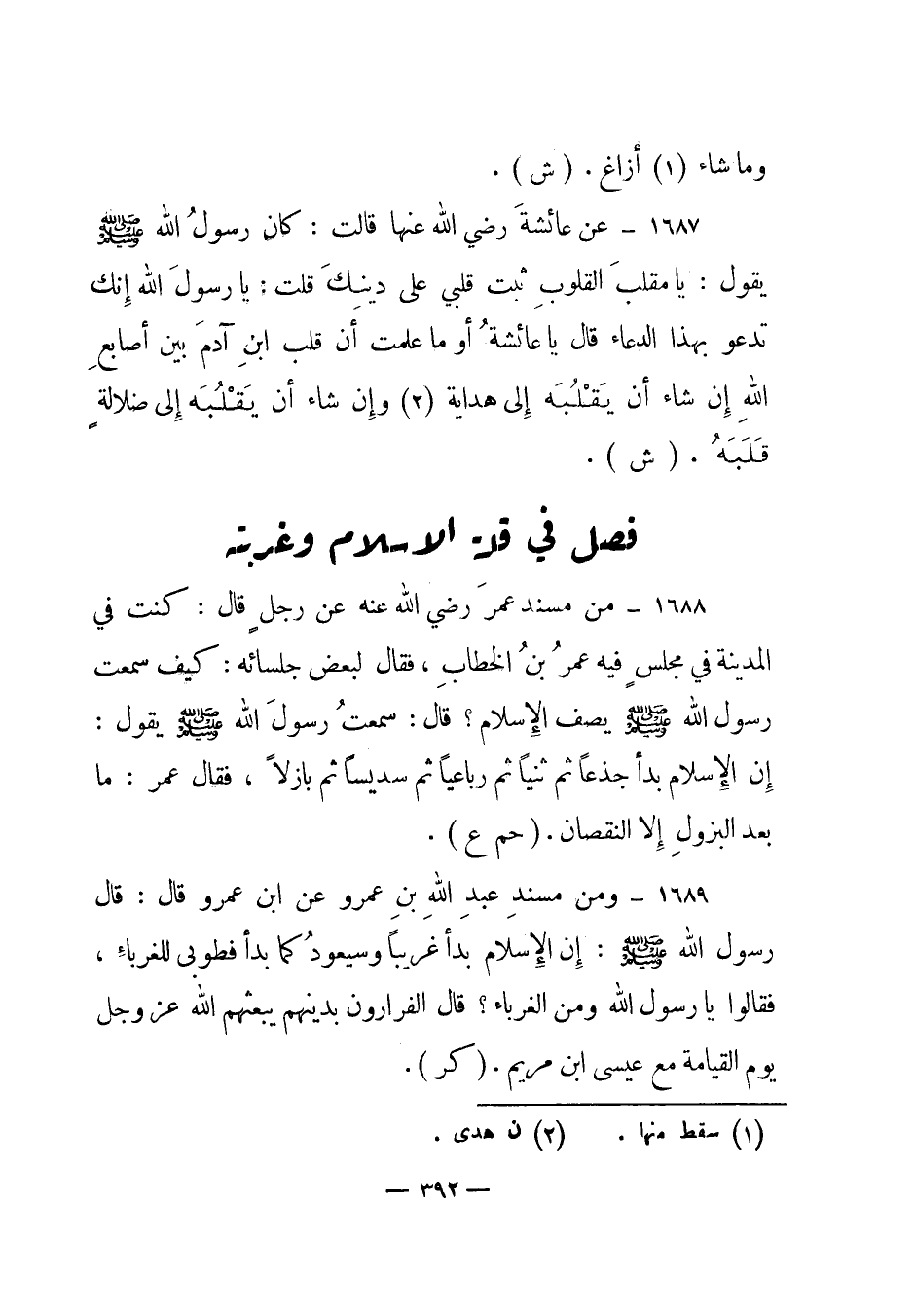 1687 - عن عائشة رضي الله عنها قالت: "كان رسول الله صلى الله عليه وسلم يقول: يا مقلب القلوب ثبت قلبي على دينك قلت: يا رسول الله إنك تدعو بهذا الدعاء قال يا عائشة أو ما علمت أن قلب ابن آدم بين أصابع الله إن شاء أن يقلبه إلى هداية (2) وإن شاء أن يقلبه إلى ضلالة قلبه". (ش) .