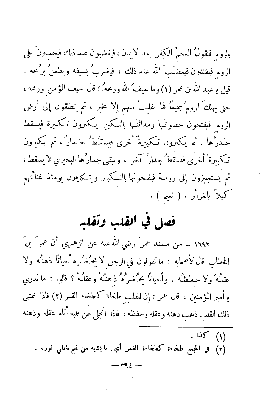 1692 - من مسند عمر رضي الله عنه عن الزهري أن عمر بن الخطاب قال لأصحابه: "ما تقولون في الرجل لا يحضره أحيانا ذهنه ولا عقله ولا حفظه، وأحيانا يحضره ذهنه وعقله؟ قالوا: ما ندري يا أمير المؤمنين، قال عمر: إن للقلب طخاء كطخاء القمر (2) فإذا غشى ذلك القلب ذهب ذهنه وعقله وحفظه، فإذا انجلى عن قلبه أتاه عقله وذهنه