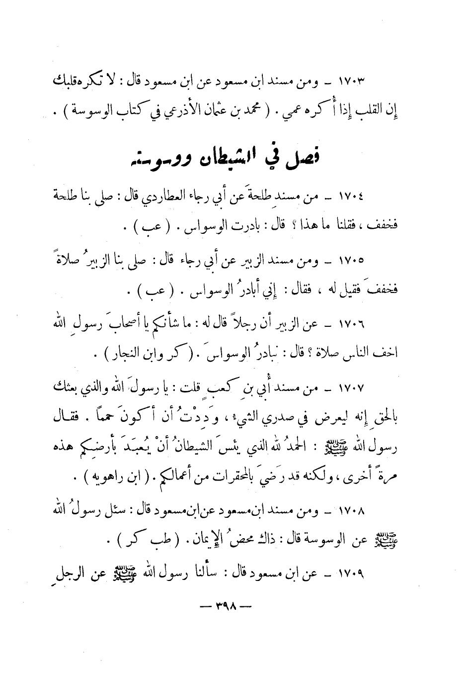 1704 - من مسند طلحة عن أبي رجاء العطاردي قال: "صلى بنا طلحة فخفف، فقلنا ما هذا؟ قال: بادرت الوسواس". (عب) .