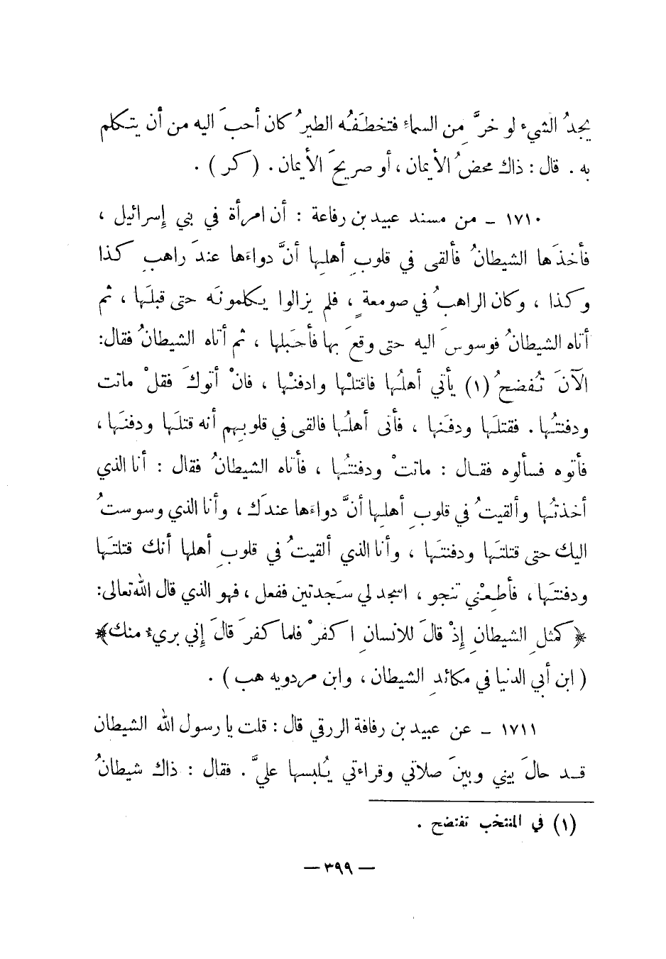 1710 - من مسند عبيد بن رفاعة: "أن امرأة في بني إسرائيل، فأخذها الشيطان فألقى في قلوب أهلها أن دواءها عند راهب كذا وكذا، وكان الراهب في صومعة، فلم يزالوا يكلمونه حتى قبلها، ثم أتاه الشيطان فوسوس إليه حتى وقع بها فأحبلها، ثم أتاه الشيطان فقال: الآن تفضح (1) يأتي أهلها فاقتلها وادفنها، فإن أتوك فقل ماتت ودفنتها. فقتلها ودفنها، فأتى أهلها فألقى في قلوبهم أنه قتلها ودفنها، فأتوه فسألوه فقال: ماتت ودفنتها، فأتاه الشيطان فقال: أنا الذي أخذتها وألقيت في قلوب أهلها أن دواءها عندك، وأنا الذي وسوست إليك حتى قتلتها ودفنتها، وأنا الذي ألقيت في قلوب أهلها أنك قتلتها ودفنتها، فأطعني تنجو، اسجد لي سجدتين ففعل، فهو الذي قال الله تعالى: {كَمَثَلِ الشَّيْطَانِ إِذْ قَالَ لِلإِنْسَانِ اكْفُرْ فَلَمَّا كَفَرَ قَالَ إِنِّي بَرِيءٌ مِنْكَ} ". (ابن أبي الدنيا في مكائد الشيطان، وابن مردويه هب) .