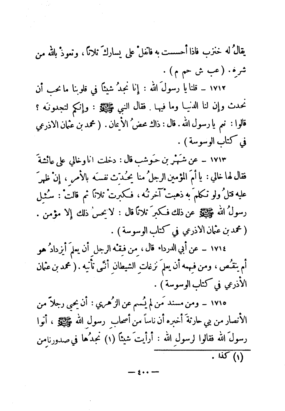 1712 - قلنا: "يا رسول الله نا نجد شيئا في قلوبنا ما يحب أن نحدث وإن لنا الدنيا وما فيها. فقال النبي صلى الله عليه وسلم: وإنكم لتجدونه؟ قالوا: نعم يا رسول الله. قال: ذاك محض الأيمان". (محمد بن عثمان الأذرعي في كتاب الوسوسة) .