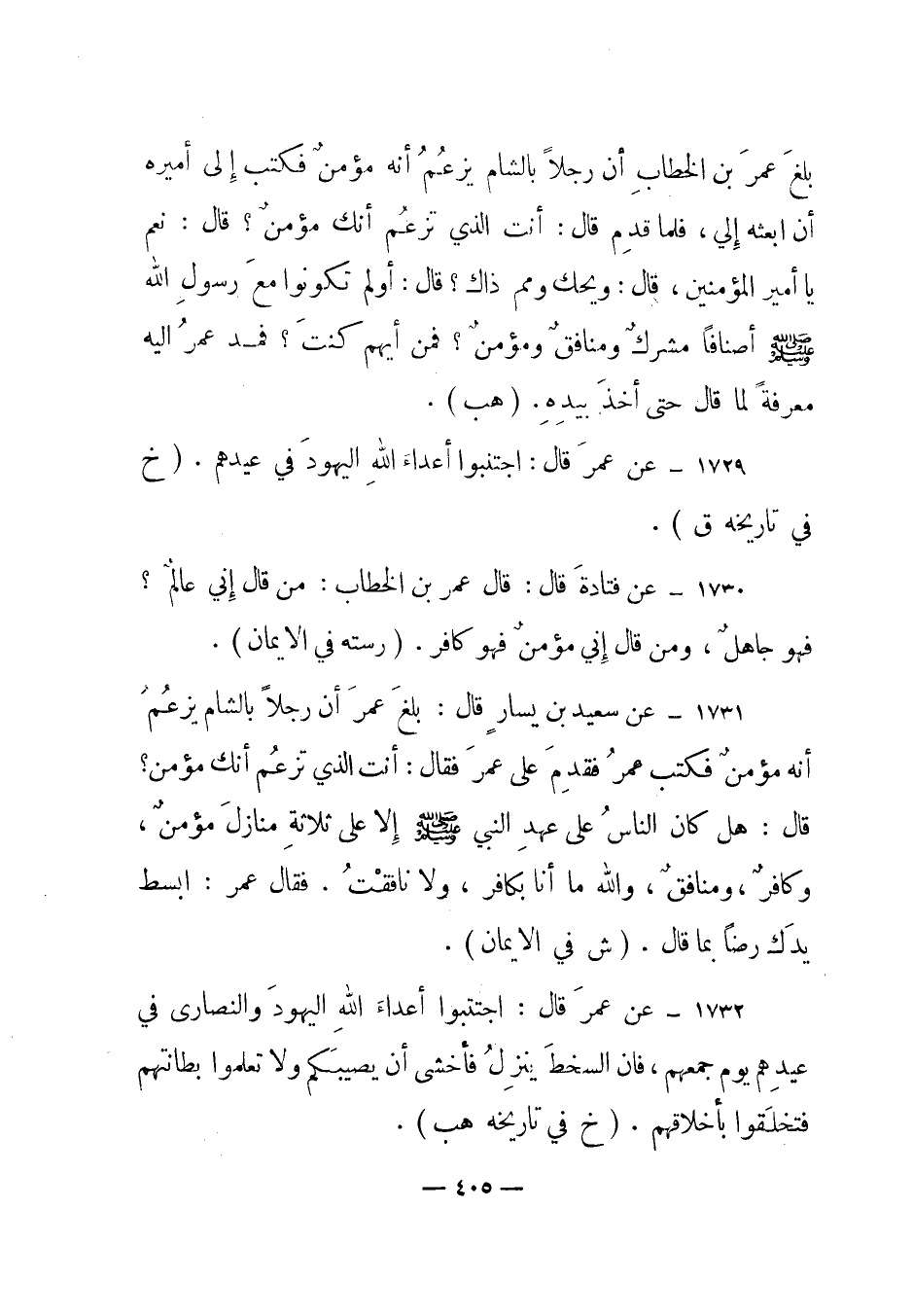 1730 - عن قتادة قال: "قال عمر بن الخطاب: من قال إني عالم؟ فهو جاهل، ومن قال إني مؤمن فهو كافر". (رسته في الإيمان) .