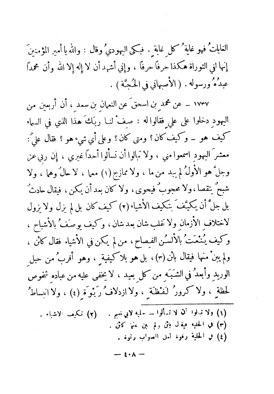 1737 - عن محمد بن إسحاق عن النعمان بن سعد، "أن أربعين من اليهود دخلوا على علي فقالوا له: صف لنا ربك هذا الذي في السماء كيف هو - وكيف كان؟ ومتى كان؟ وعلى أي شيء هو؟ فقال علي: معشر اليهود اسمعوا مني، ولا تبالوا أن تسألوا أحدا غيري، إن ربي عز وجل هو الأول لم يبد مما ولا ممازج (1) معما، لا حال وهما، ولا شبح يتقصا، ولا محجوب فيحوى، ولا كان بعد أن يكن، فيقال حادث بل جل أن يكيف بتكيف الأشياء (2) كيف كان بل لم يزل ولا يزول لاختلاف الأزمان ولا تقلب شان بعد شان، وكيف يوصف بالأشباح، وكيف ينعت بالألسن الفصاح، من لم يكن بالأشياء فقال كائن، ولم يبن منها فيقال بائن (3) بل هو بلا كيفية، وهو أقرب من حبل الوريد وأبعد في الشبه من كل بعيد، لا يخفى عليه من عباده شخوص لحظة، ولا كرور لفظة، ولا ازدلاف ربوة (4) ، ولا انبساط