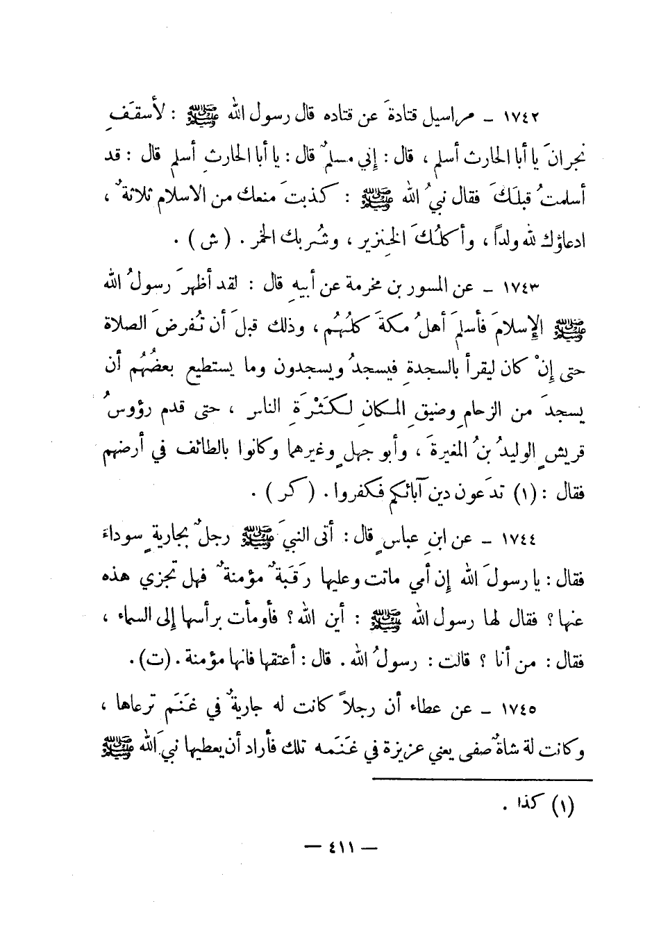 1742 - مراسيل قتادة عن قتادة قال رسول الله صلى الله عليه وسلم لأسقف نجران: "يا أبا الحارث أسلم، قال: إني مسلم قال: يا أبا الحارث أسلم قال: قد أسلمت قبلك فقال نبي الله صلى الله عليه وسلم: كذبت منعك من الإسلام ثلاثة: ادعاؤك لله ولدا، وأكلك الخنزير، وشربك الخمر". (ش) .
