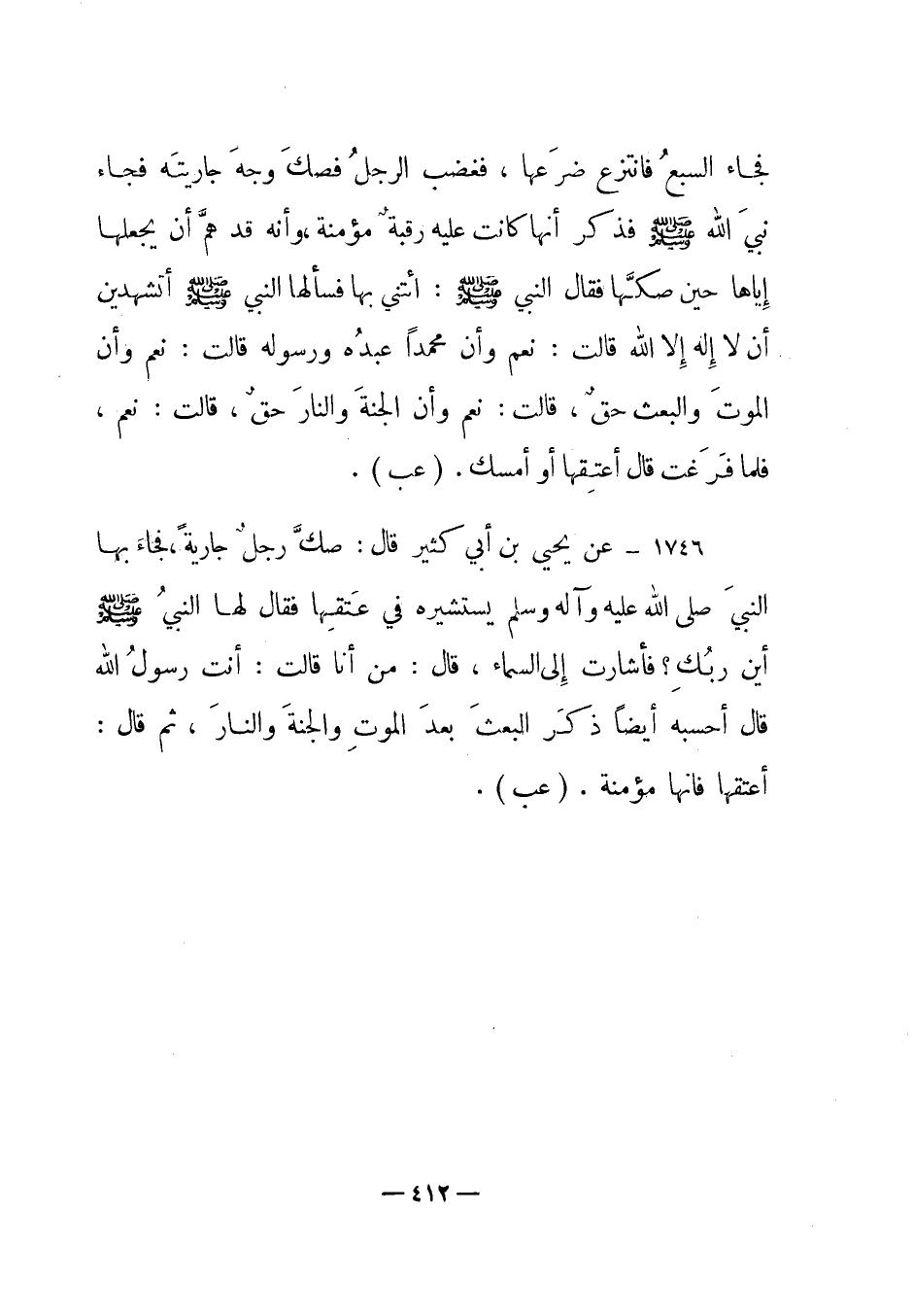 1746 - عن يحيى بن أبي كثير قال: " صك رجل جارية، فجاء بها النبي صلى الله عليه وآله وسلم يستشيره في عتقها فقال لها النبي صلى الله عليه وسلم أين ربك؟ فأشارت إلى السماء قال: من أنا قالت: أنت رسول الله قال أحسبه أيضا ذكر البعث بعد الموت والجنة والنار، ثم قال: أعتقها فإنها مؤمنة". (عب) .