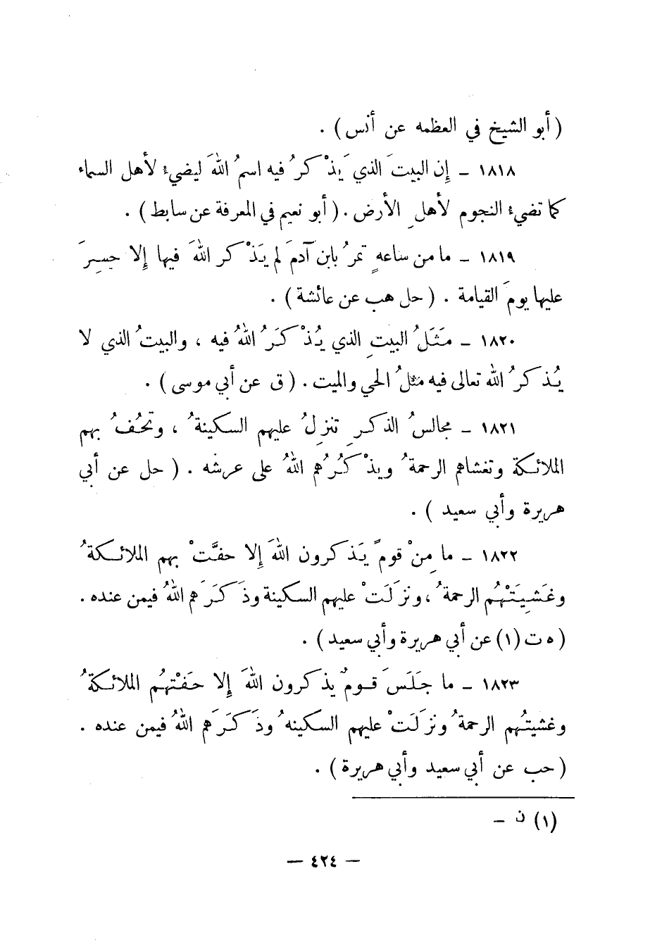 1823 – "ما جلس قوم يذكرون الله إلا حفتهم الملائكة وغشيتهم الرحمة ونزلت عليهم السكينه وذكرهم الله فيمن عنده". (حب عن أبي سعيد وأبي هريرة) .
