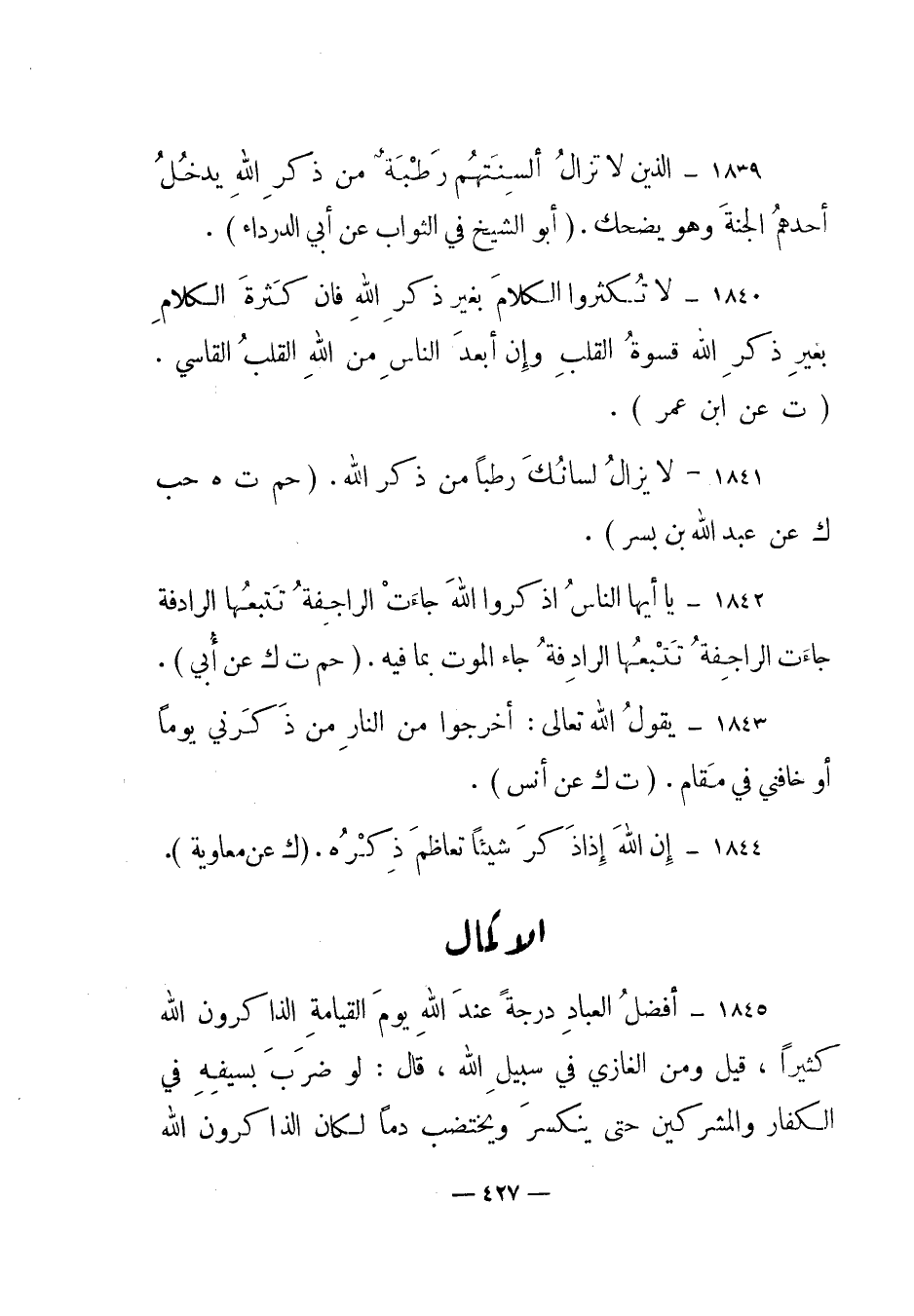 1845 – "أفضل العباد درجة عند الله يوم القيامة الذاكرون الله كثيرا، قيل ومن الغازي في سبيل الله، قال: لو ضرب بسيفه في الكفار والمشركين حتى ينكسر ويختضب دما لكان الذاكرون الله