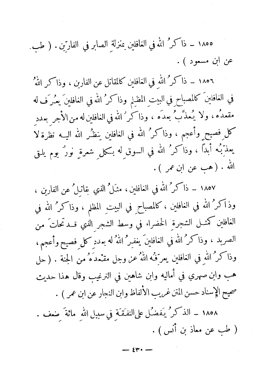 1857 – "ذاكر الله في الغافلين، مثل الذي يقاتل عن الفارين، وذاكر الله في الغافلين، كالمصباح في البيت المظلم، وذاكر الله في الغافلين كمثل الشجرة الخضراء في وسط الشجر الذي قد تحات من الصريد، وذاكر الله في الغافلين يغفر الله له بعدد كل فصيح وأعجم، وذاكر الله في الغافلين يعرفه الله عز وجل مقعده من الجنة". (حل هب وابن صهري في أماليه وابن شاهين في الترغيب وقال هذا حديث صحيح الإسناد حسن المتن غريب الألفاظ وابن النجار عن ابن عمر) .