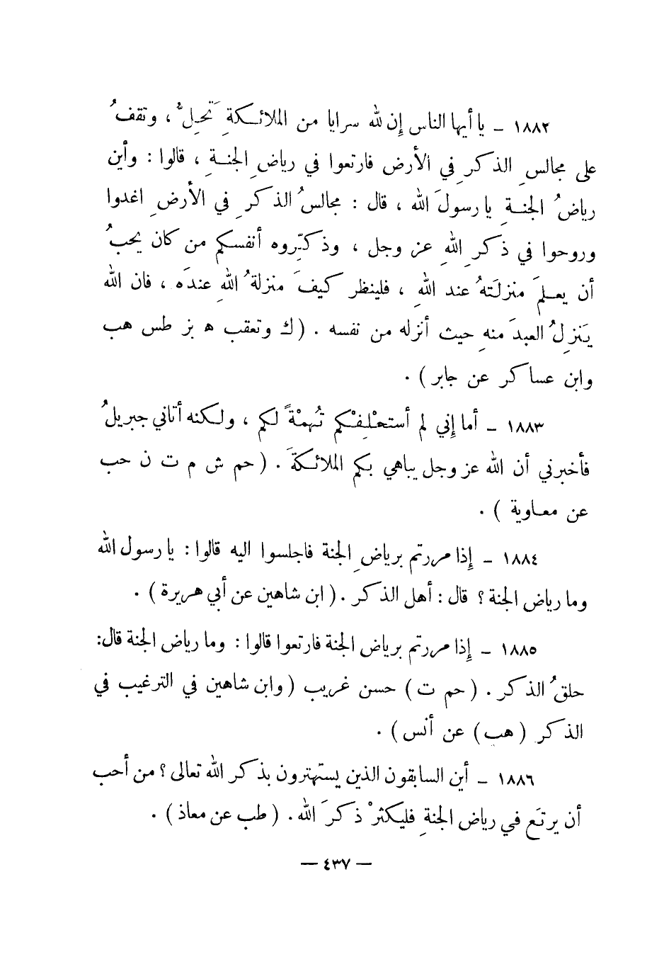 1885 – "إذا مررتم برياض الجنة فارتعوا قالوا: وما رياض الجنة قال: حلق الذكر". (حم ت) حسن غريب (وابن شاهين في الترغيب في الذكر (هب) عن أنس) .