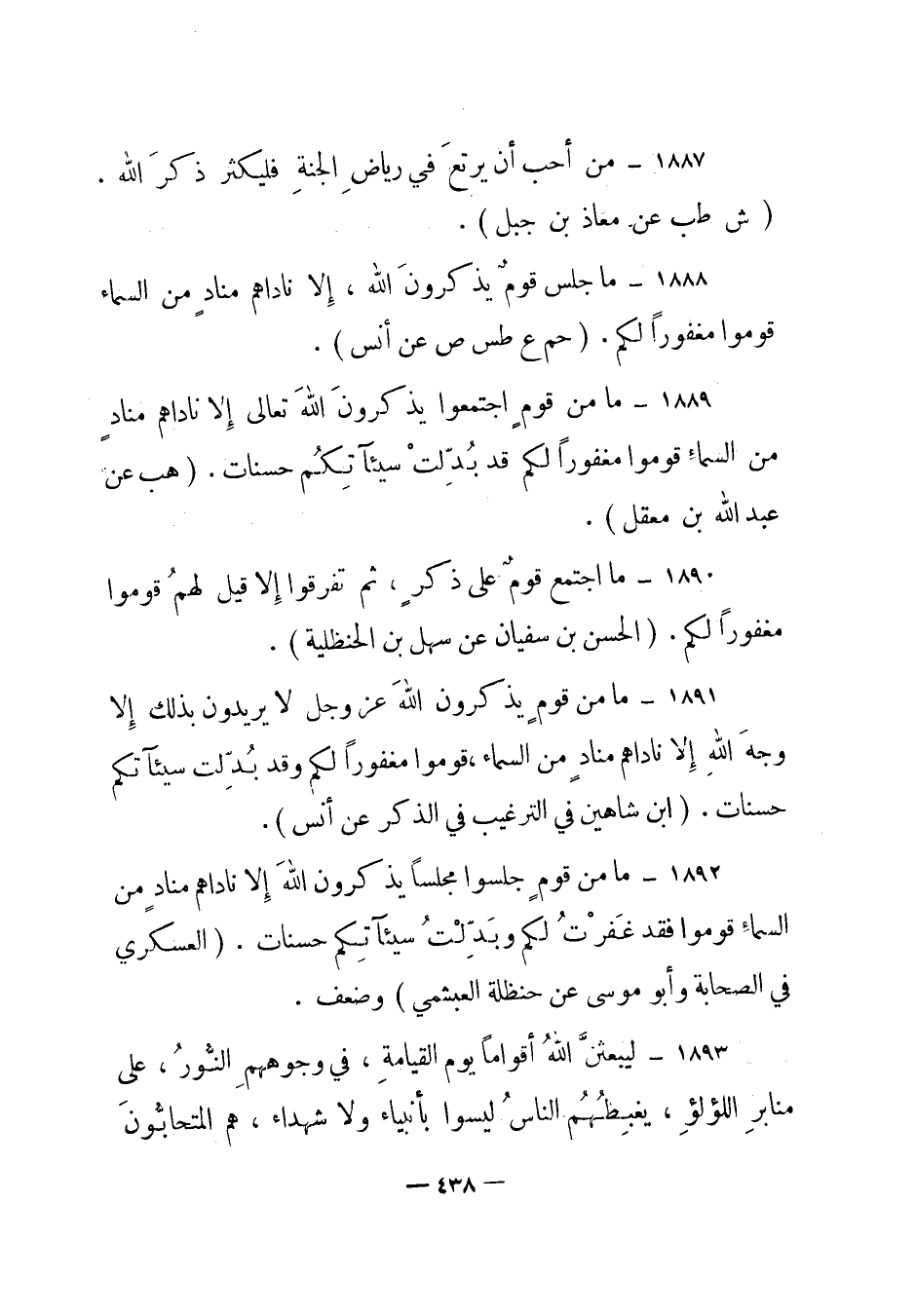 1888 – "ما جلس قوم يذكرون الله، إلا ناداهم مناد من السماء قوموا مغفورا لكم". (حم ع طس ص عن أنس) .