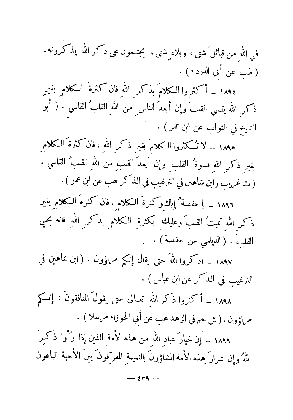 1894 – "أكثروا الكلام بذكر الله فإن كثرة الكلام بغير ذكر الله يقسي القلب وإن أبعد الناس من الله القلب القاسي". (أبو الشيخ في الثواب عن ابن عمر) .