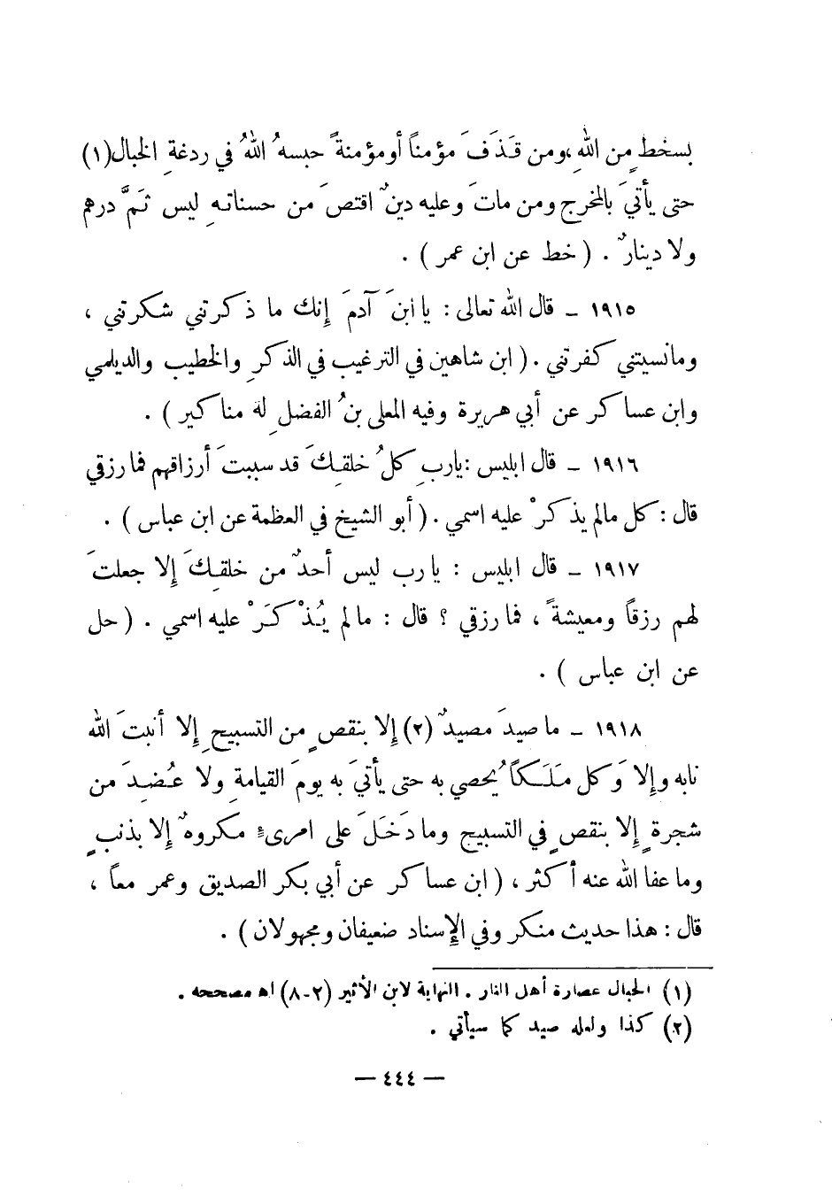 1918 – "ما صيد مصيد (2) إلا بنقص من التسبيح إلا أنبت الله نابه وإلا وكل ملكا يحصي به حتى يأتي به يوم القيامة ولا عضد من شجرة إلا بنقص في التسبيح وما دخل على امرئ مكروه إلا بذنب وما عفا الله عنه أكثر"، (ابن عساكر عن أبي بكر الصديق وعمر معا، قال: هذا حديث منكر وفي الإسناد ضعيفان ومجهولان) .