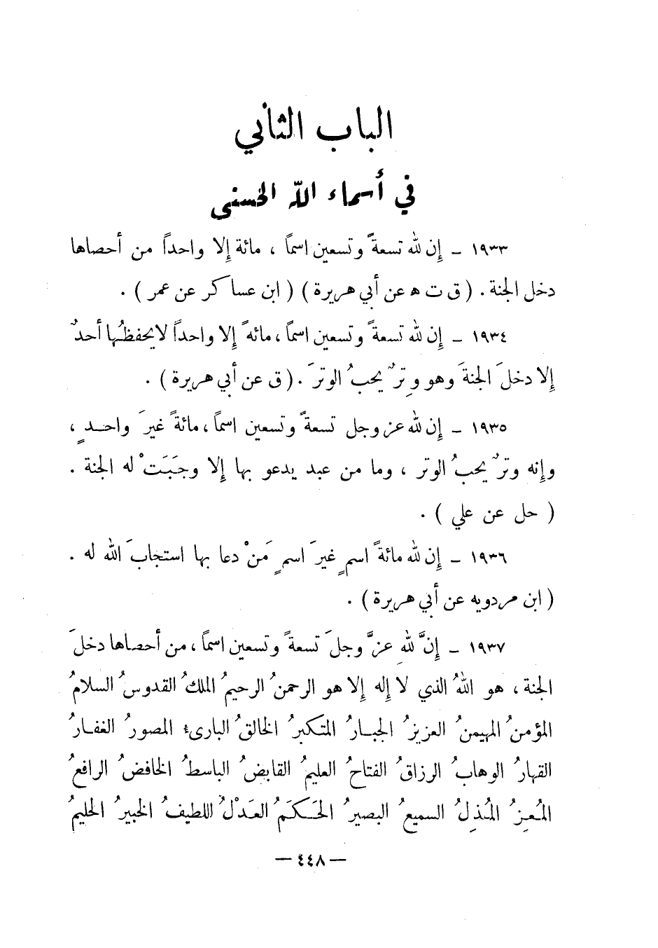 1933 – "إن لله تسعة وتسعين اسما، مائة إلا واحدا من أحصاها دخل الجنة". (ق ت هـ عن أبي هريرة)