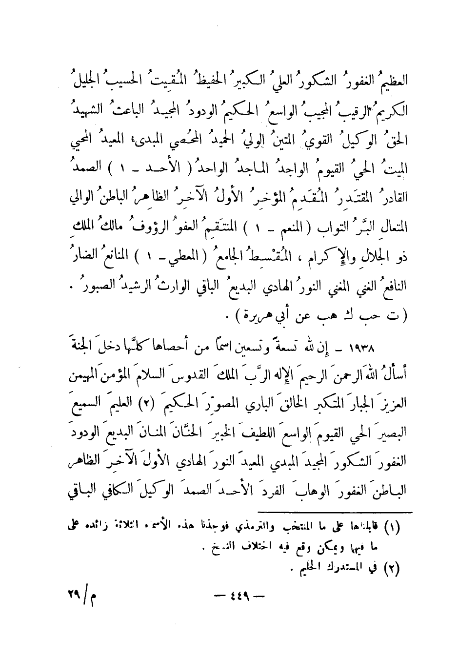 1938 – "إن لله تسعة وتسعين اسما من أحصاها كلها دخل الجنة أسأل الله الرحمن الرحيم الإله الرب الملك القدوس السلام المؤمن المهيمن العزيز الجبار المتكبر الخالق الباري المصور الحكيم (2) العليم السميع البصير الحي القيوم الواسع اللطيف الخبير الحنان المنان البديع الودود الغفور الشكور المجيد المبدي المعيد النور الهادي الأول الآخر الظاهر الباطن الغفور الوهاب الفرد الأحد الصمد الوكيل الكافي الباقي