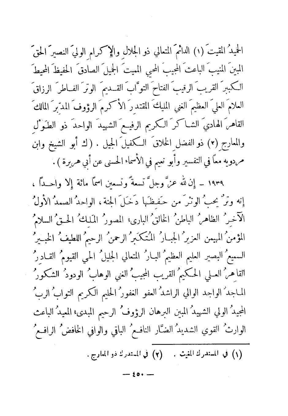 الحميد المقيت (1) الدائم المتعالي ذو الجلال والإكرام الولي النصير الحق المبين المنيب الباعث المجيب المحيي المميت الجميل الصادق الحفيظ المحيط الكبير القريب الرقيب الفتاح التواب القديم الوتر الفاطر الرزاق العلام العلي العظيم الغني المليك المقتدر الأكرم الرؤوف المدبر المالك القاهر الهادي الشاكر الكريم الرفيع الشهيد الواحد ذو الطول والمعارج (2) ذو الفضل الخلاق الكفيل الجليل". (ك أبو الشيخ وابن مردويه معا في التفسير وأبو نعيم في الأسماء الحسنى عن أبي هريرة) .
