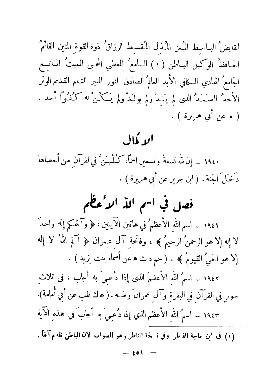 1942 – "اسم الله الأعظم الذي إذا دعي به أجاب، في ثلاث سور في القرآن في البقرة وآل عمران وطه". (هـ ك طب عن أبي أمامة) .