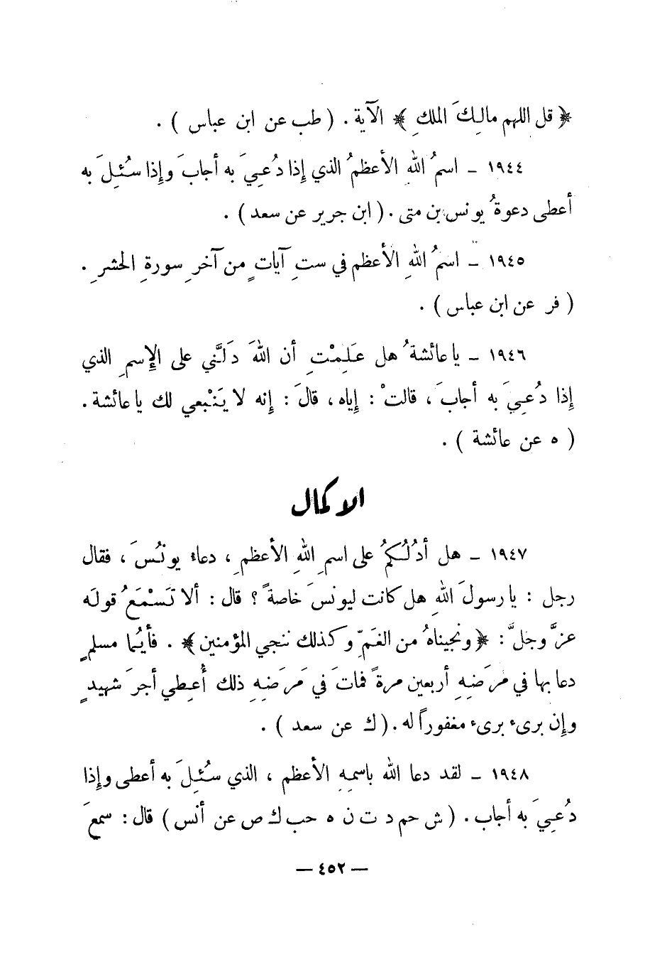 1944 – "اسم الله الأعظم الذي إذا دعي به أجاب وإذا سئل به أعطى دعوة يونس بن متى". (ابن جرير عن سعد) .