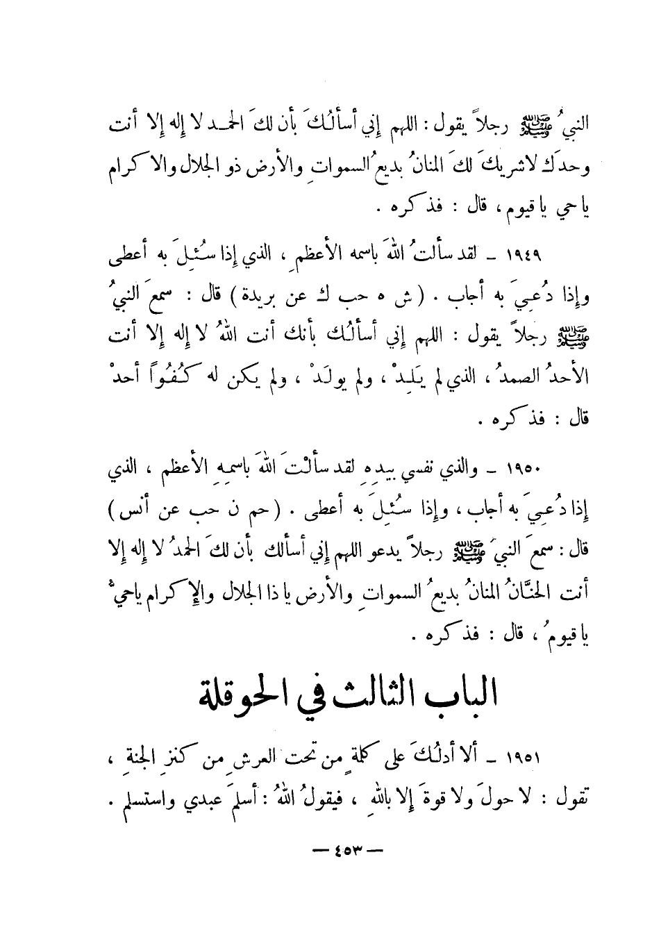 1951 - " ألا أدلك على كلمة من تحت العرش من كنز الجنة، تقول: لا حول ولا قوة إلا بالله، فيقول الله: أسلم عبدي واستسلم.