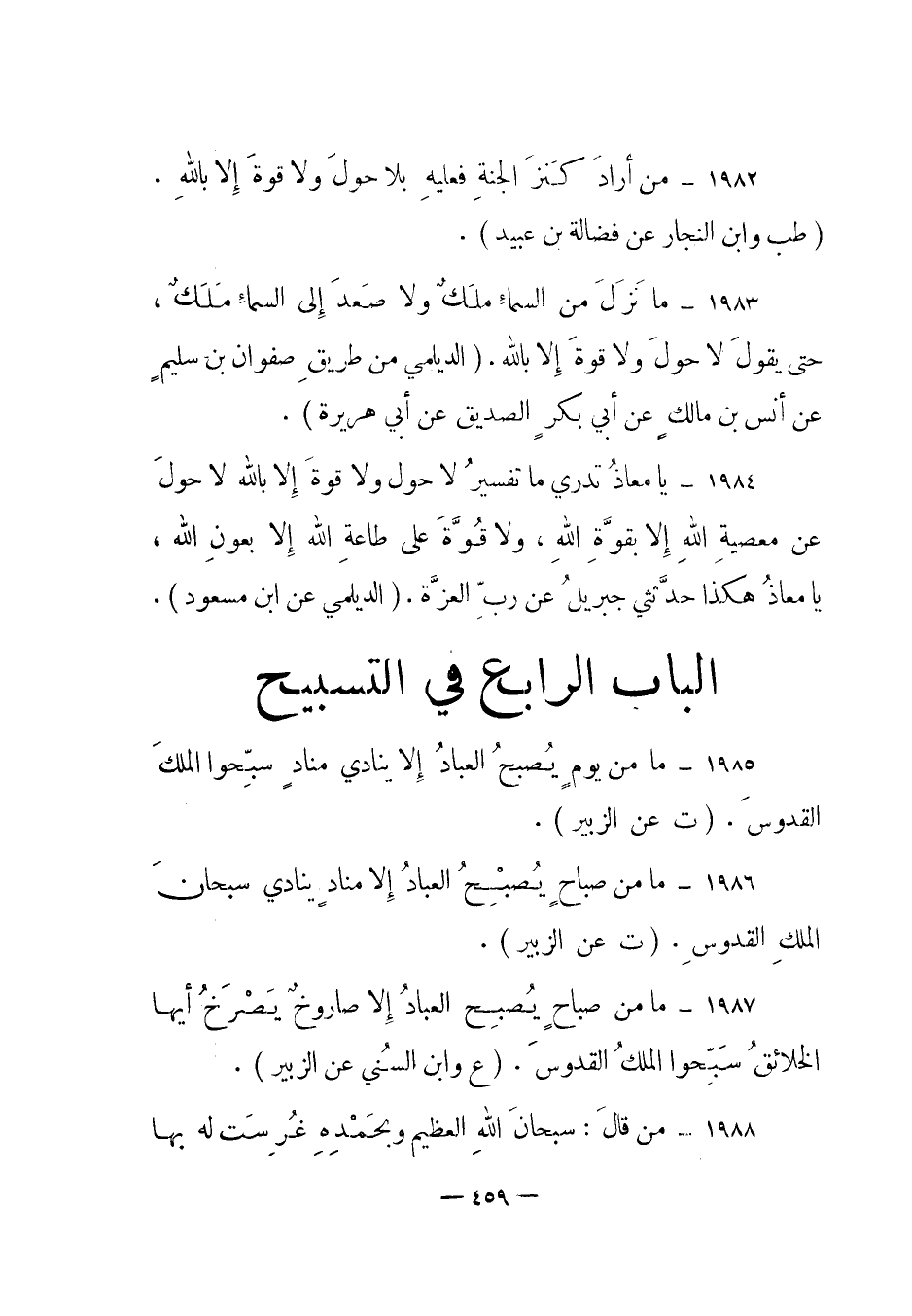 1986 – "ما من صباح يصبح العباد إلا مناد ينادي سبحان الملك القدوس". (ت عن الزبير) .