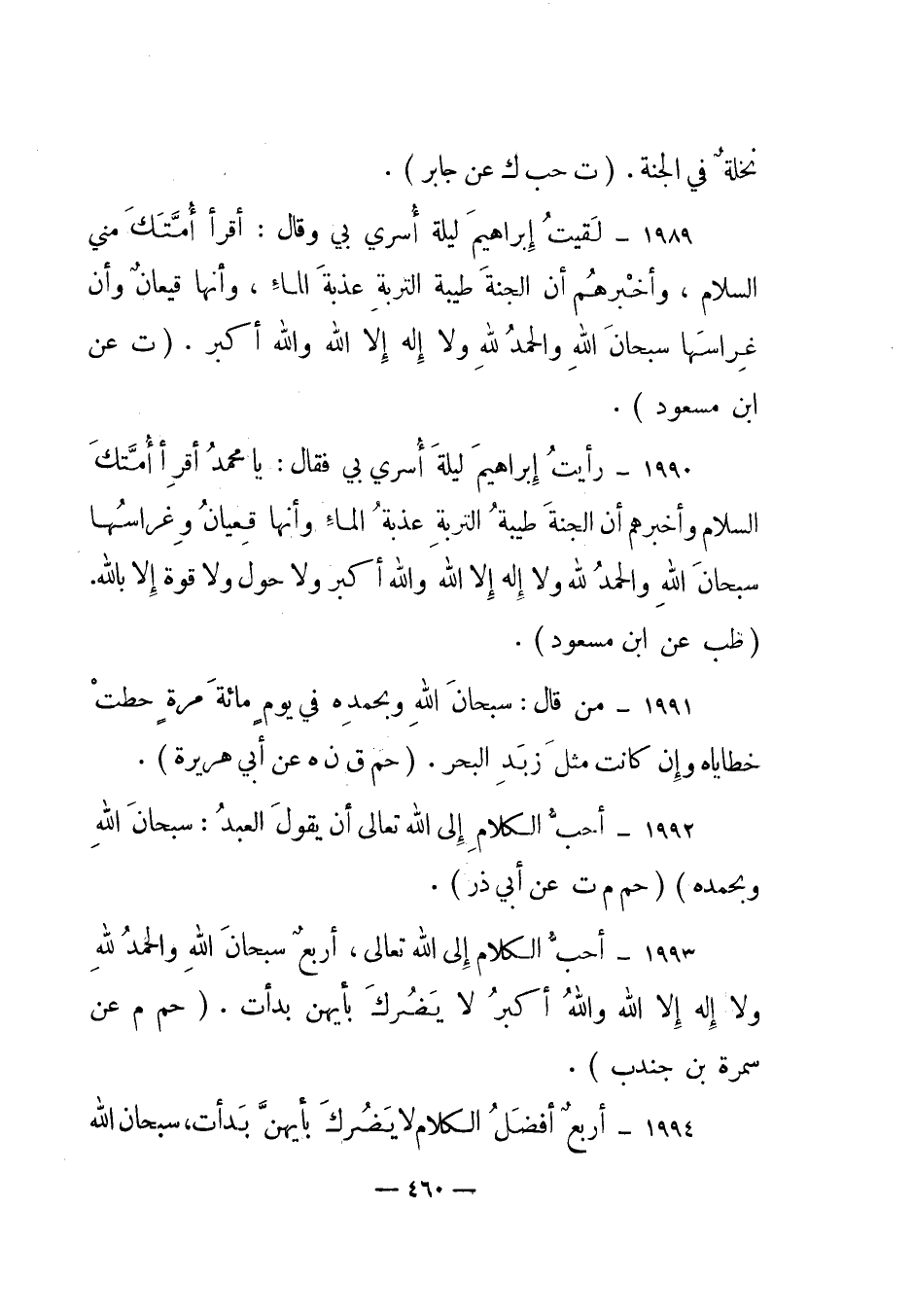 1989 – "لقيت إبراهيم ليلة أسري بي وقال: أقرأ أمتك مني السلام، وأخبرهم أن الجنة طيبة التربة عذبة الماء، وأنها قيعان وأن غراسها سبحان الله والحمد لله ولا إله إلا الله والله أكبر". (ت عن ابن مسعود) .